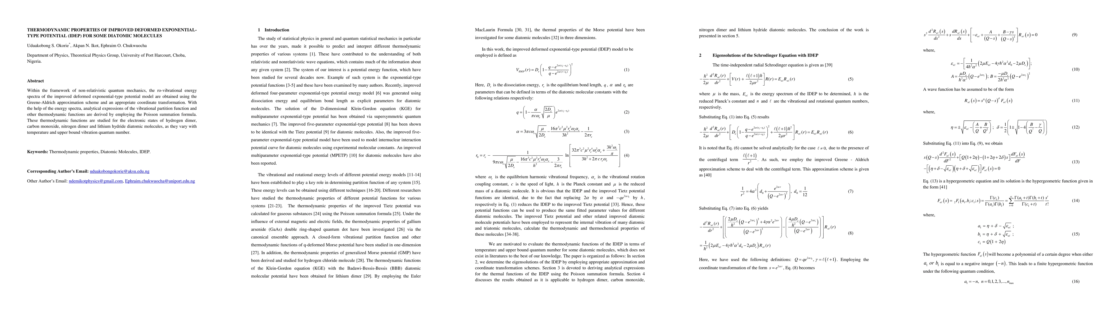 This paper studies thermodynamic properties of diatomic molecules using an improved deformed exponential-type potential model, deriving analytical expressions for vibrational partition functions and other thermodynamic functions.