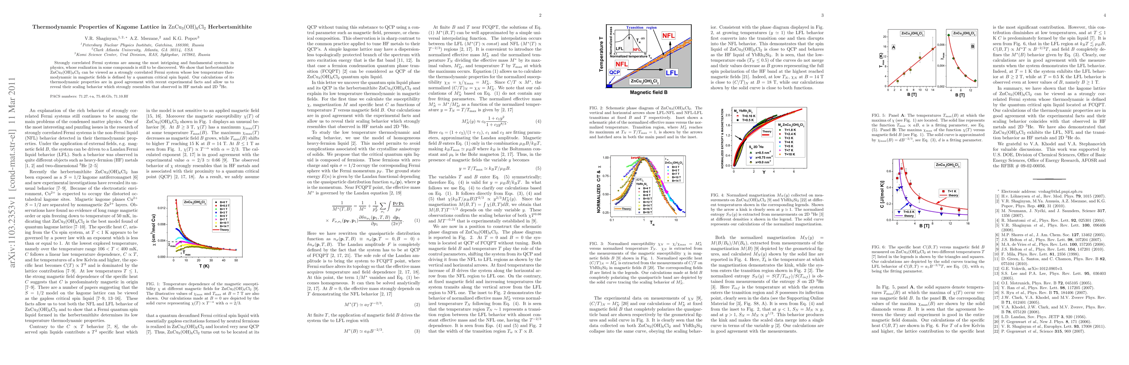 This paper investigates the thermodynamic properties of herbertsmithite, a compound with a kagome lattice, revealing it as a strongly correlated Fermi system characterized by a quantum critical spin liquid. The study's calculations align well with experimental data, highlighting its unique scaling behavior akin to high-field metals and 2D 3He.