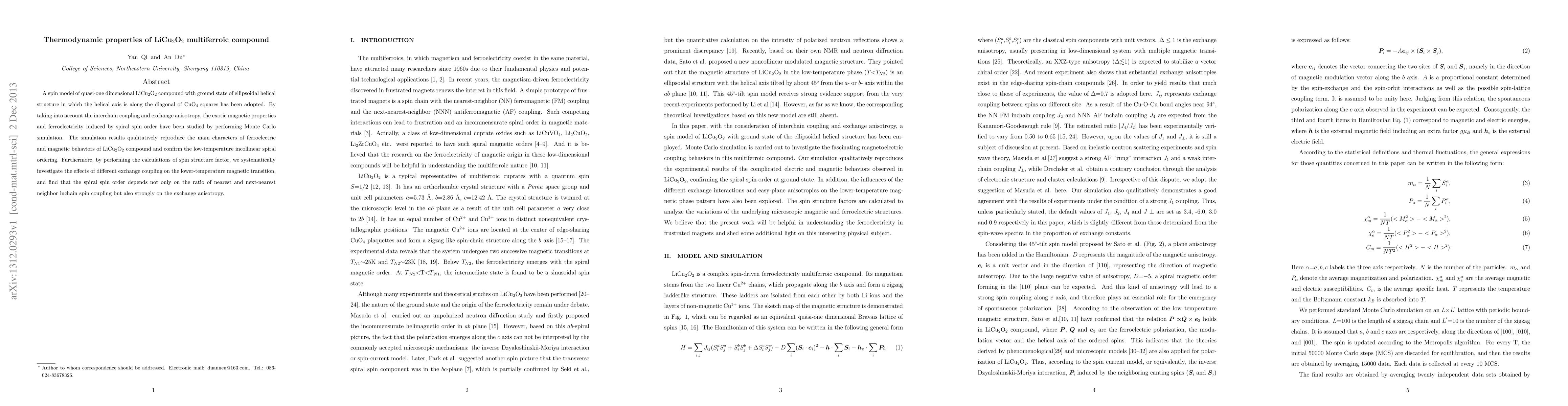 Researchers studied LiCu2O2 multiferroic compound using a spin model and Monte Carlo simulation to understand its magnetic properties and ferroelectricity, finding that exchange anisotropy plays a crucial role in the compound's behavior.