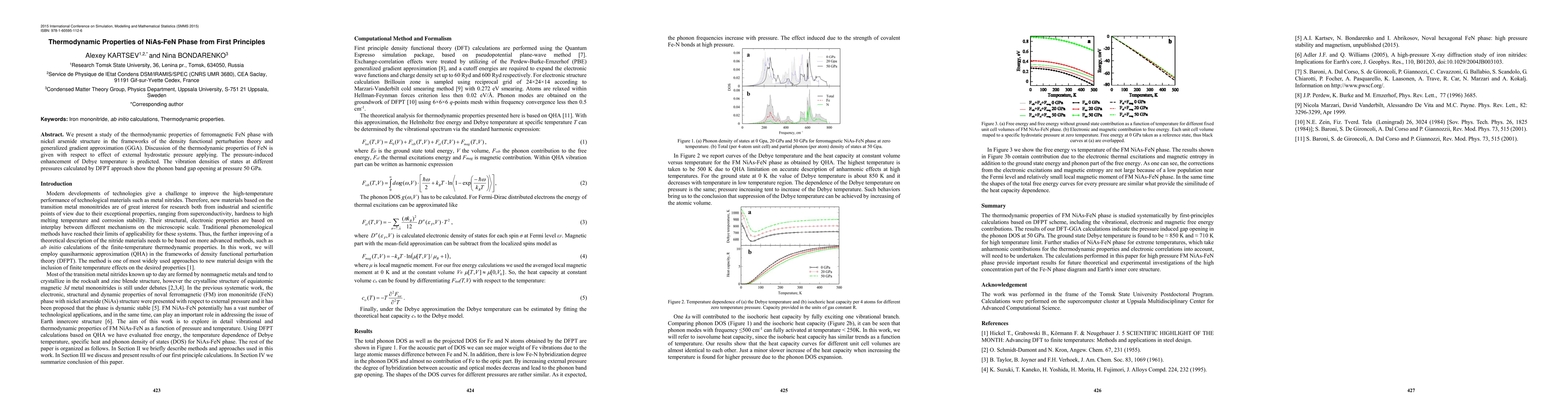 This study uses density functional perturbation theory and GGA to examine FeN's thermodynamic properties, revealing pressure-induced enhancements in Debye temperature and phonon band gap opening at 50 GPa in the NiAs-FeN phase.