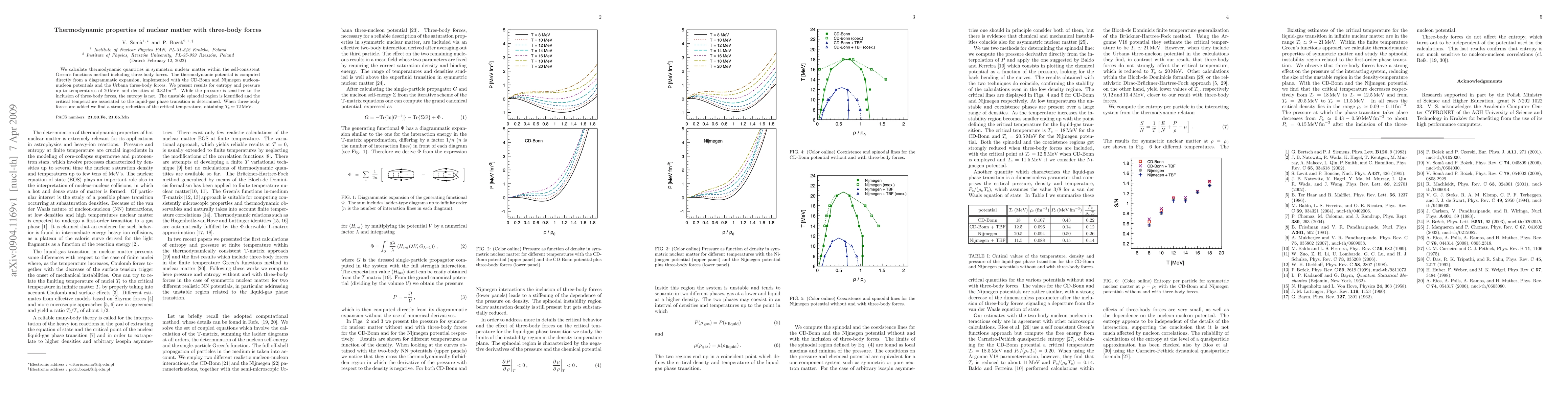 This paper calculates thermodynamic properties of nuclear matter using the self-consistent Green's functions method, incorporating three-body forces and nucleon-nucleon potentials. The inclusion of three-body forces significantly reduces the critical temperature for the liquid-gas phase transition to approximately 12 MeV.