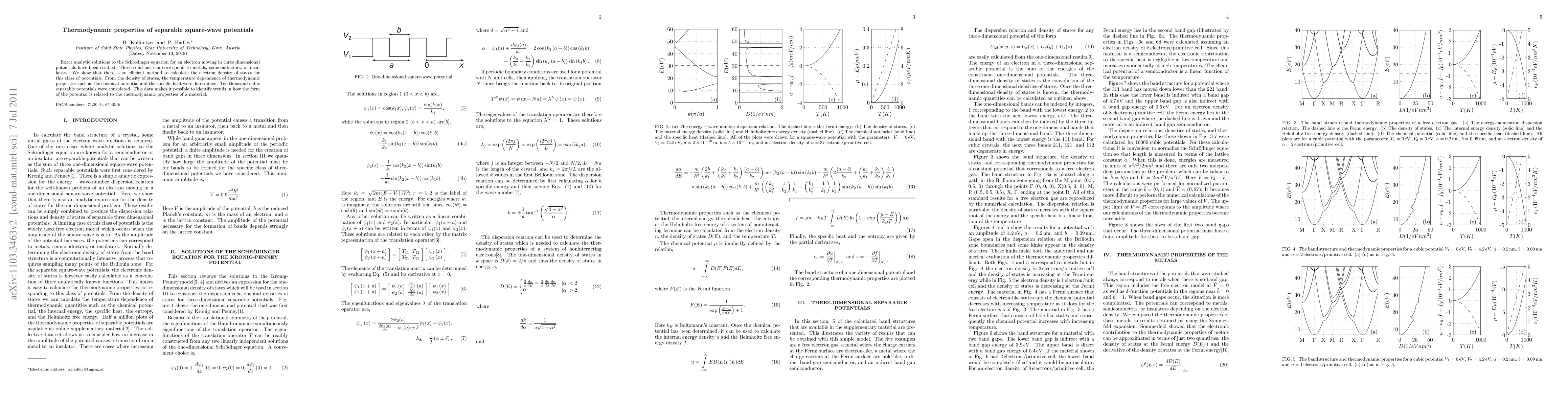 This paper presents an efficient method for calculating the electron density of states in three-dimensional separable square-wave potentials, enabling the determination of thermodynamic properties like chemical potential and specific heat. The study analyzes ten thousand cubic separable potentials to identify trends linking potential form and material thermodynamic behavior.