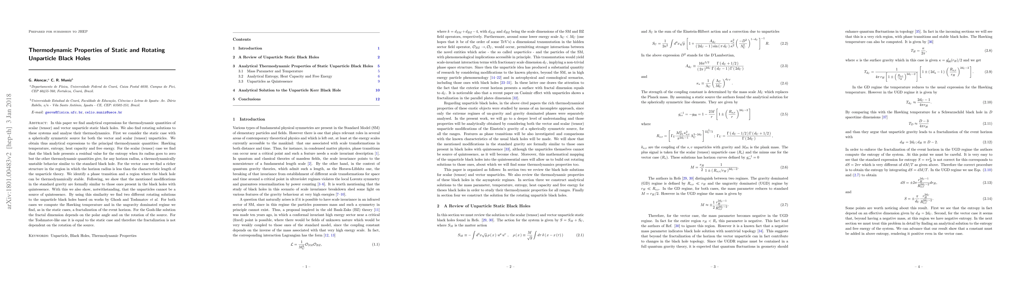 This paper derives analytical expressions for thermodynamic properties of static and rotating unparticle black holes, identifying phase transitions and stability regions. It finds that rotating solutions exhibit fractal event horizons, with dimensions dependent on rotation parameters in one case and independent in another.