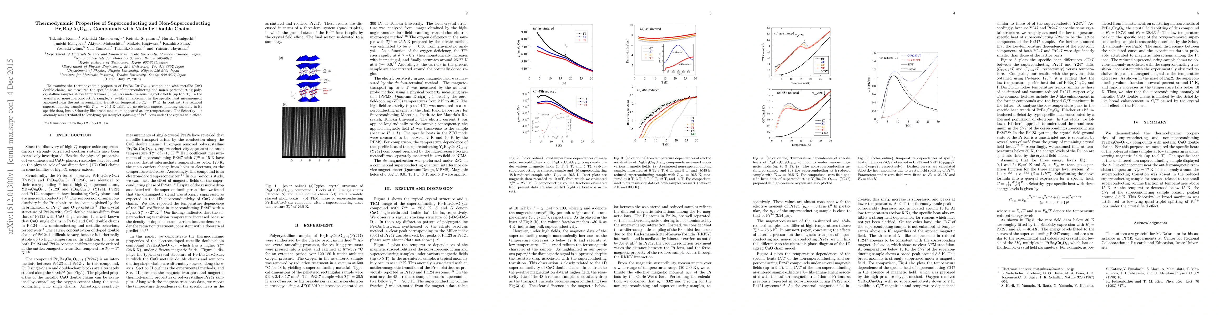 To examine the thermodynamic properties of Pr$_{2}$Ba$_{4}$Cu$_{7}$O$_{15-\delta }$ compounds with metallic CuO double chains, we measured the specific heats of superconducting and non-superconducting polycrystalline samples at low temperatures (1.8-40 K) under various magnetic fields (up to 9 T). In the as-sintered non-superconducting sample, a $\lambda-$like enhancement in the specific heat measurement appeared near the antiferromagnetic transition temperature $T_{N}=17$ K. In contrast, the reduced superconducting sample with $T_{c,on}=26.5$ K exhibited no obvious superconducting anomaly in its specific data, but a Schottky-like broad maximum appeared at low temperatures. The Schottky-like anomaly was attributed to low-lying quasi-triplet splitting of Pr$^{3+}$ ions under the crystal field effect.