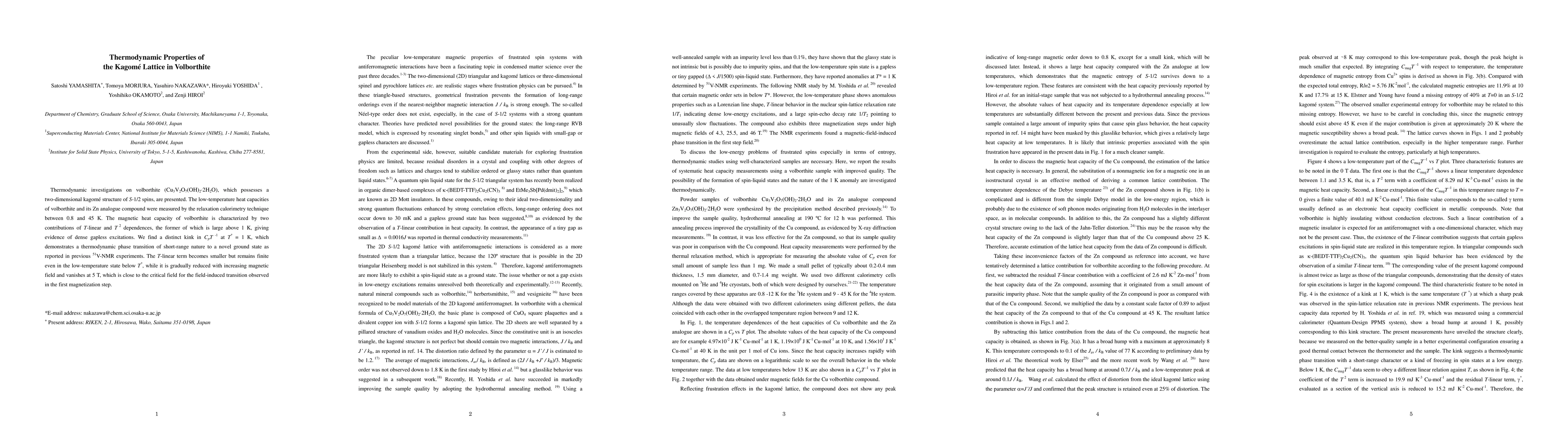 This paper investigates the thermodynamic properties of volborthite, a material with a kagome lattice structure, through low-temperature heat capacity measurements. It reveals a distinct phase transition at 1 K and dense gapless excitations, with the T-linear term diminishing under magnetic fields, indicating a field-induced transition.