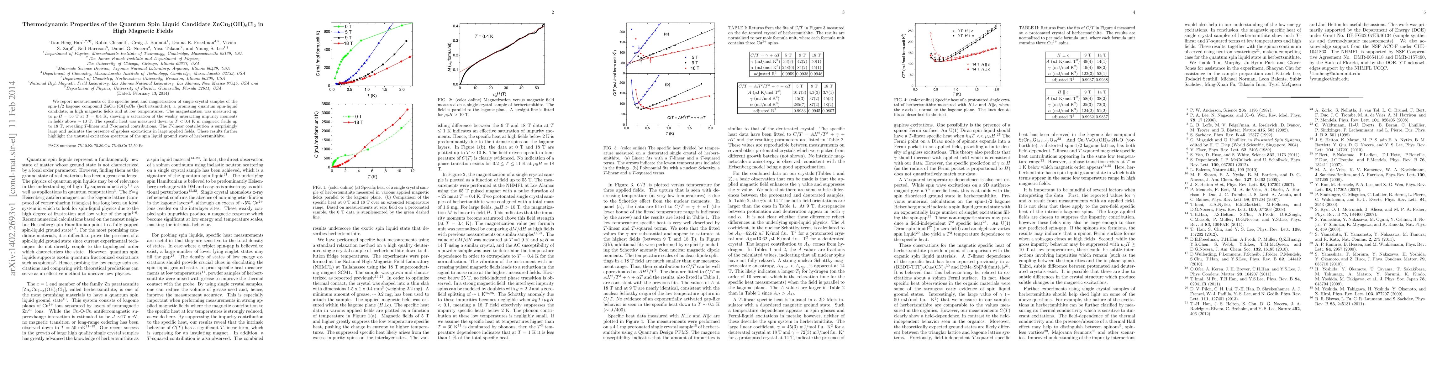 We report measurements of the specific heat and magnetization of single crystal samples of the spin-1/2 kagome compound ZnCu$_{3}$(OH)$_{6}$Cl$_{2}$ (herbertsmithite), a promising quantum spin-liquid candidate, in high magnetic fields and at low temperatures. The magnetization was measured up to $\mu_{0}H$ = 55 T at $T$ = 0.4 K, showing a saturation of the weakly interacting impurity moments in fields above $\sim10$ T. The specific heat was measured down to $T < 0.4$ K in magnetic fields up to 18 T, revealing $T$-linear and $T$-squared contributions. The $T$-linear contribution is surprisingly large and indicates the presence of gapless excitations in large applied fields. These results further highlight the unusual excitation spectrum of the spin liquid ground state of herbertsmithite.