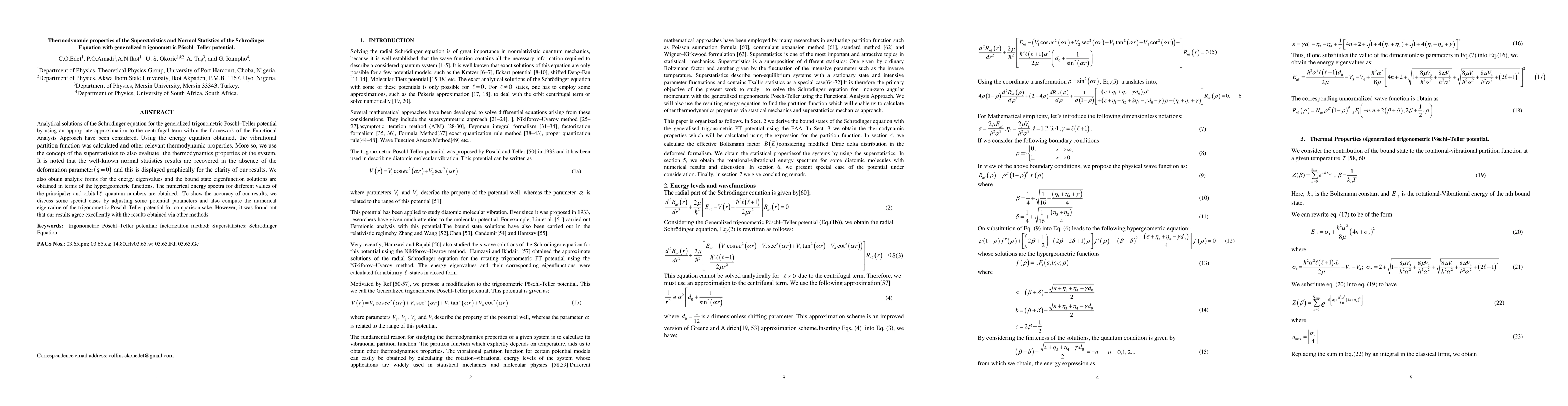 Analytical solutions of the Schrodinger equation for the generalized trigonometric Poschl Teller potential by using an appropriate approximation to the centrifugal term within the framework of the Functional Analysis Approach have been considered. Using the energy equation obtained, the vibrational partition function was calculated and other relevant thermodynamic properties. More so, we use the concept of the superstatistics to also evaluate the thermodynamics properties of the system. It is noted that the well-known normal statistics results are recovered in the absence of the deformation parameter and this is displayed graphically for the clarity of our results. We also obtain analytic forms for the energy eigenvalues and the bound state eigenfunction solutions are obtained in terms of the hypergeometric functions. The numerical energy spectra for different values of the principal and orbital quantum numbers are obtained. To show the accuracy of our results, we discuss some special cases by adjusting some potential parameters and also compute the numerical eigenvalue of the trigonometric Poschl Teller potential for comparison sake. However, it was found out that our results agree excellently with the results obtained via other methods
