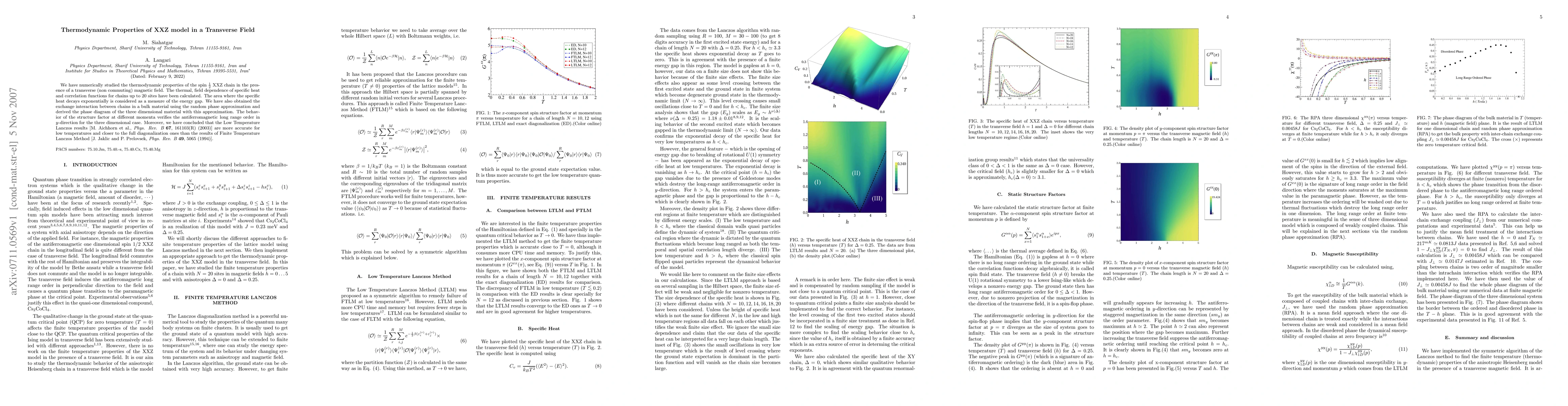We have numerically studied the thermodynamic properties of the spin 1/2 XXZ chain in the presence of a transverse (non commuting) magnetic field. The thermal, field dependence of specific heat and correlation functions for chains up to 20 sites have been calculated. The area where the specific heat decays exponentially is considered as a measure of the energy gap. We have also obtained the exchange interaction between chains in a bulk material using the random phase approximation and derived the phase diagram of the three dimensional material with this approximation. The behavior of the structure factor at different momenta verifies the antiferromagnetic long range order in y-direction for the three dimensional case. Moreover, we have concluded that the Low Temperature Lanczos results [M. Aichhorn et al., Phys. Rev. B 67, 161103(R) (2003)] are more accurate for low temperatures and closer to the full diagonalization ones than the results of Finite Temperature Lanczos Method [J. Jaklic and P. Prelovsek, Phys. Rev. B 49, 5065 (1994)].