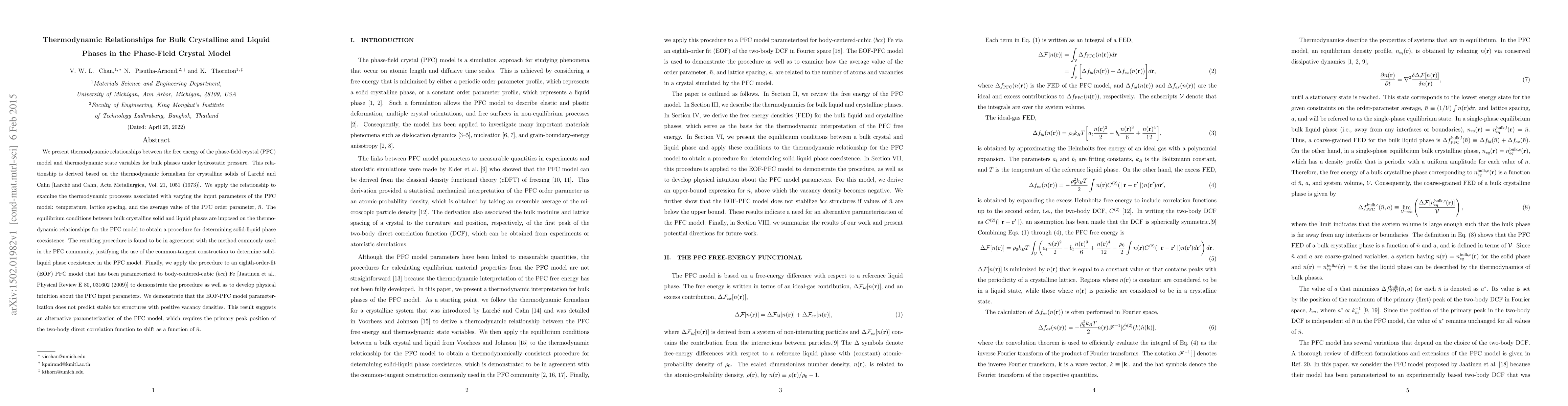 We present thermodynamic relationships between the free energy of the phase-field crystal (PFC) model and thermodynamic state variables for bulk phases under hydrostatic pressure. This relationship is derived based on the thermodynamic formalism for crystalline solids of Larch\'e and Cahn [Larch\'e and Cahn, Acta Metallurgica, Vol. 21, 1051 (1973)]. We apply the relationship to examine the thermodynamic processes associated with varying the input parameters of the PFC model: temperature, lattice spacing, and the average value of the PFC order parameter, $\bar{n}$. The equilibrium conditions between bulk crystalline solid and liquid phases are imposed on the thermodynamic relationships for the PFC model to obtain a procedure for determining solid-liquid phase coexistence. The resulting procedure is found to be in agreement with the method commonly used in the PFC community, justifying the use of the common-tangent construction to determine solid-liquid phase coexistence in the PFC model. Finally, we apply the procedure to an eighth-order-fit (EOF) PFC model that has been parameterized to body-centered-cubic ($bcc$) Fe [Jaatinen et al., Physical Review E 80, 031602 (2009)] to demonstrate the procedure as well as to develop physical intuition about the PFC input parameters. We demonstrate that the EOF-PFC model parameterization does not predict stable $bcc$ structures with positive vacancy densities. This result suggests an alternative parameterization of the PFC model, which requires the primary peak position of the two-body direct correlation function to shift as a function of $\bar{n}$.