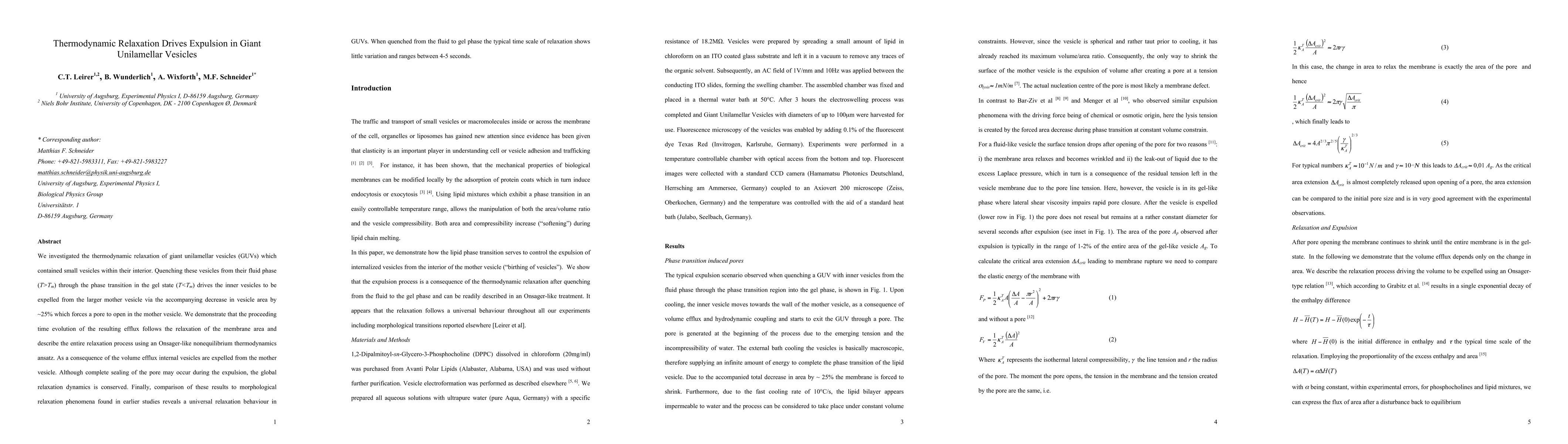This paper investigates how thermodynamic relaxation in giant unilamellar vesicles (GUVs) induces the expulsion of smaller vesicles upon phase transition from fluid to gel state, driven by a 25% decrease in membrane area. The efflux process follows the relaxation dynamics described by an Onsager-like nonequilibrium thermodynamics model, revealing a universal relaxation time scale of 4-5 seconds.