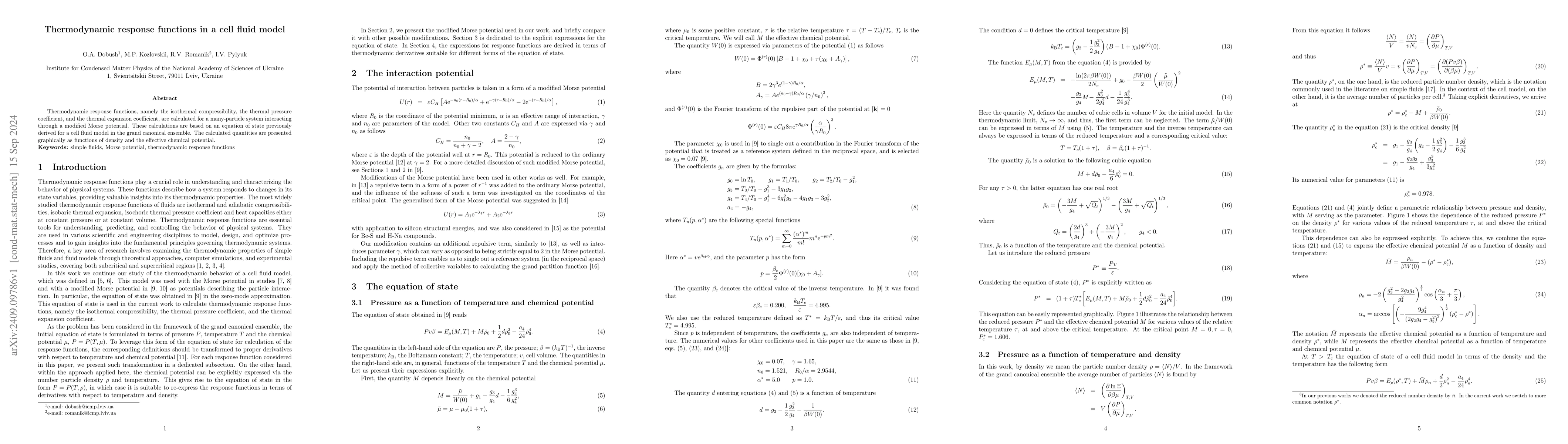 Summary: The paper calculates thermodynamic response functions for a many-particle system using a modified Morse potential within a cell fluid model, presenting results graphically as density and chemical potential vary. These functions include isothermal compressibility, thermal pressure coefficient, and thermal expansion coefficient.