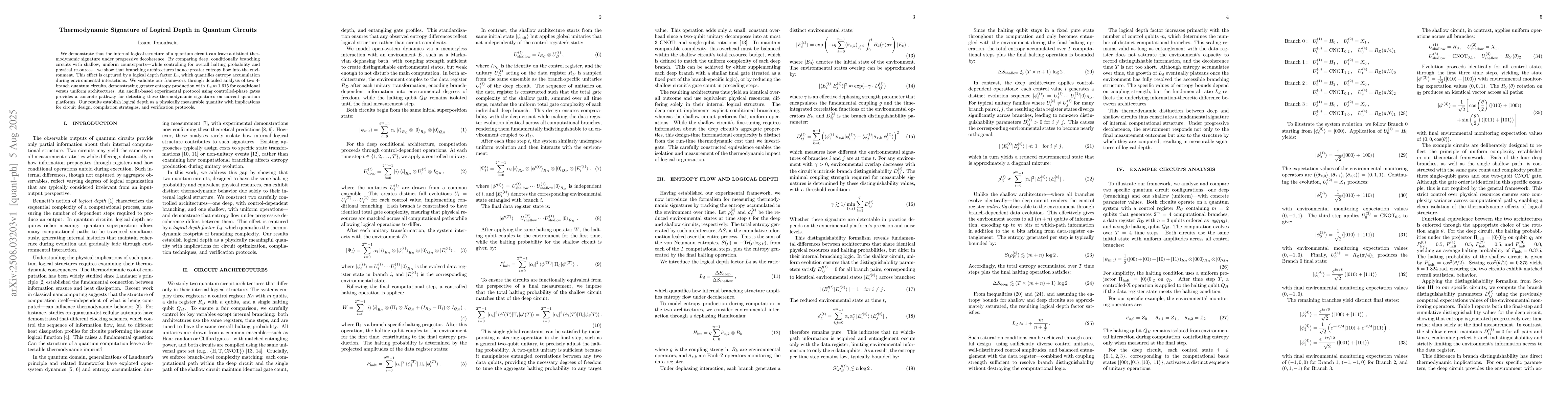 We demonstrate that the internal logical structure of a quantum circuit can leave a distinct thermodynamic signature under progressive decoherence. By comparing deep, conditionally branching circuits with shallow, uniform counterparts-while controlling for overall halting probability and physical resources-we show that branching architectures induce greater entropy flow into the environment. This effect is captured by a logical depth factor $L_d$, which quantifies entropy accumulation during environmental interactions. We validate our framework through detailed analysis of two 4-branch quantum circuits, demonstrating greater entropy production with $L_d \approx 1.615$ for conditional versus uniform architectures. An ancilla-based experimental protocol using controlled-phase gates provides a concrete pathway for detecting these thermodynamic signatures on current quantum platforms. Our results establish logical depth as a physically measurable quantity with implications for circuit design, compilation strategies, and verification protocols.