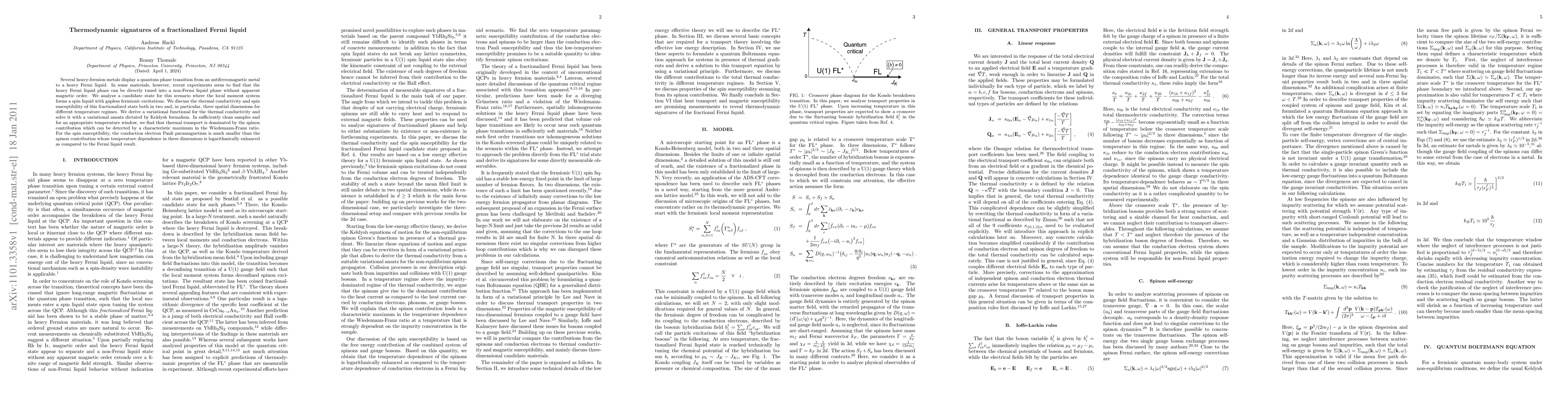This paper investigates thermodynamic signatures in a fractionalized Fermi liquid state, where heavy-fermion metals transition into a non-Fermi liquid phase without magnetic order. The study reveals the thermal conductivity and spin susceptibility in two and three dimensions, showing a characteristic maximum in the Wiedemann-Franz ratio due to spinon contributions, and a logarithmically enhanced spin susceptibility in three dimensions compared to the Fermi liquid.