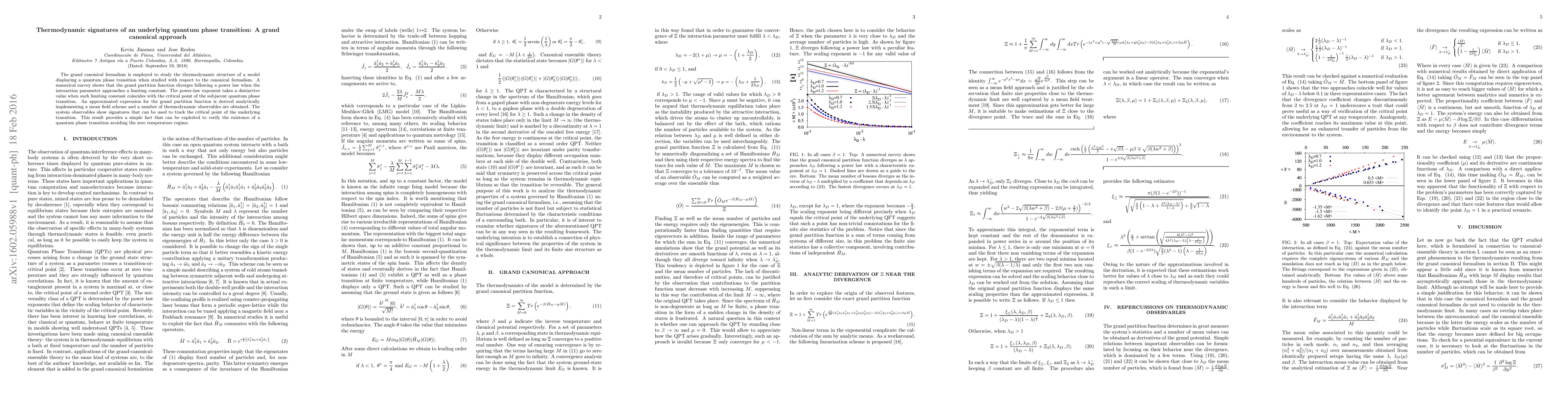 The grand canonical formalism is employed to study the thermodynamic structure of a model displaying a quantum phase transition when studied with respect to the canonical formalism. A numerical survey shows that the grand partition function diverges following a power law when the interaction parameter approaches a limiting constant. The power-law exponent takes a distinctive value when such limiting constant coincides with the critical point of the subjacent quantum phase transition. An approximated expression for the grand partition function is derived analytically implementing a mean field scheme and a number of thermodynamic observables are obtained. The system observables show signatures that can be used to track the critical point of the underlying transition. This result provides a simple fact that can be exploited to verify the existence of a quantum phase transition avoiding the zero temperature regime.