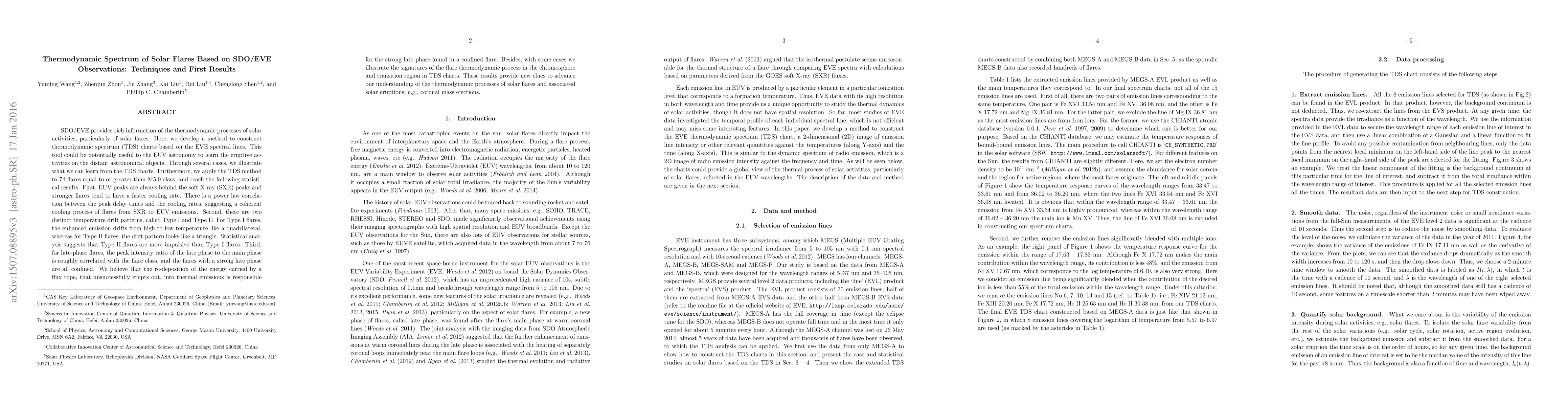 This paper develops a thermodynamic spectrum (TDS) method using SDO/EVE data to analyze solar flares, revealing a coherent cooling process from soft X-ray to EUV emissions. It identifies two distinct temperature drift patterns, Type I and Type II, with Type II flares showing more impulsive behavior and strong late-phase emissions likely due to energy re-deposition in confined flares.