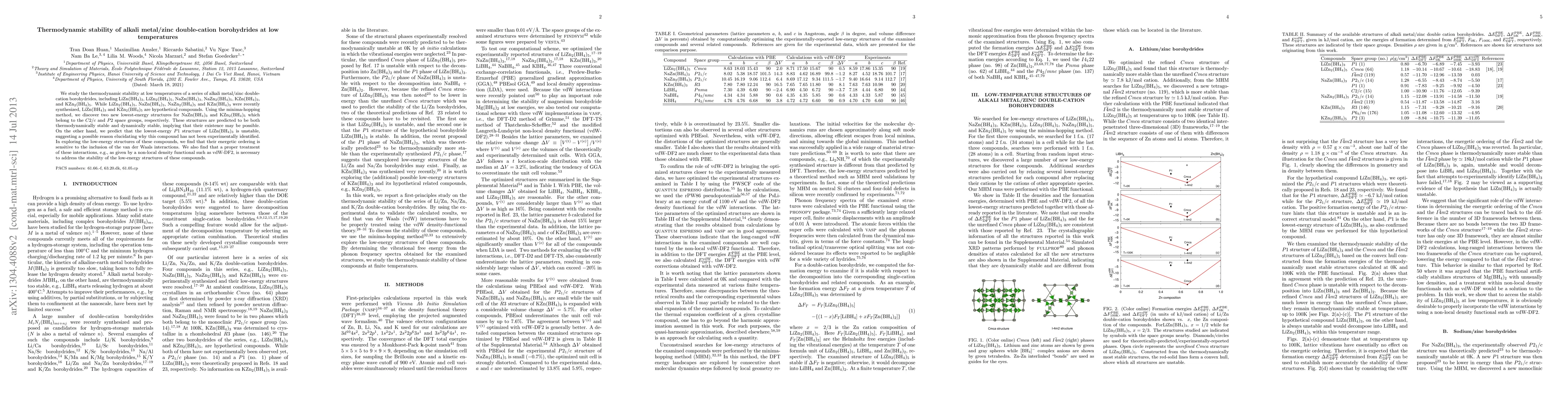 This research investigates the thermodynamic stability of a series of alkali metal/zinc double-cation borohydrides at low temperatures, discovering new lowest-energy structures for some compounds and predicting thermodynamic stability for NaZn(BH$_4$)$_3$ and KZn$_2$(BH$_4$)$_5$. The study highlights the importance of van der Waals interactions in determining the energetic ordering and stability of these compounds.