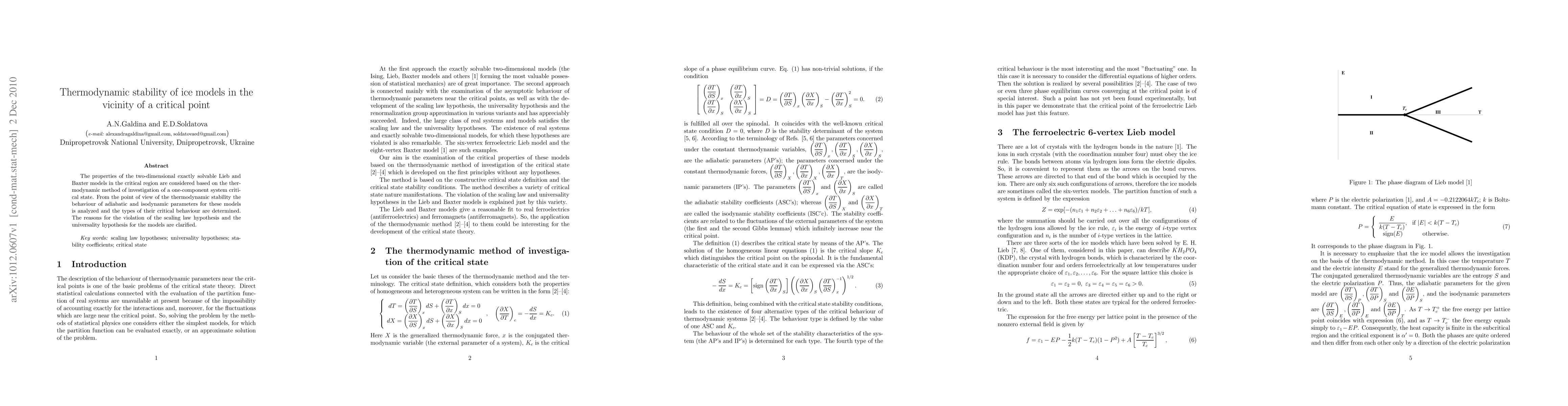 The properties of the two-dimensional exactly solvable Lieb and Baxter models in the critical region are considered based on the thermodynamic method of investigation of a one-component system critical state. From the point of view of the thermodynamic stability the behaviour of adiabatic and isodynamic parameters for these models is analyzed and the types of their critical behaviour are determined. The reasons for the violation of the scaling law hypothesis and the universality hypothesis for the models are clarified.