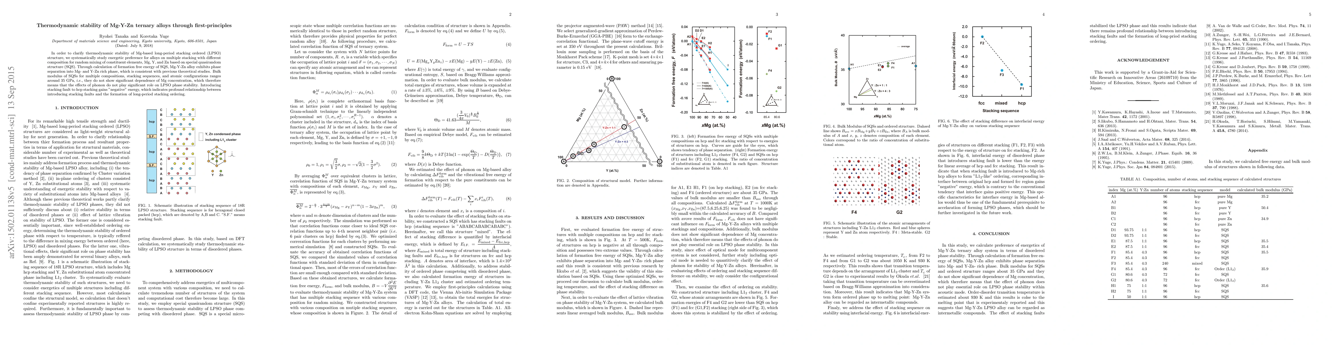 In order to clarify thermodynamic stability of Mg-based long-period stacking ordered (LPSO) structure, we systematically study energetic preference for alloys on multiple stacking with different composition for random mixing of constituent elements, Mg, Y, and Zn based on special quasirandom structure (SQS). Through calculation of formation free energy of SQS, Mg-Y-Zn alloy exhibits phase separation into Mg- and Y-Zn rich phase, which is consistent with previous theoretical studies. Bulk modulus of SQSs for multiple compositions, stacking sequences, and atomic configuratons ranges around 35 GPa, i.e., they do not show significant dependence of Mg concentration, which therefore means that the effects of phonon do not play significant role on LPSO phase stability. Introducing stacking fault to hcp stacking gains "negative" energy, which indicates profound relationship between introducing stacking faults and the formation of long-period stacking ordering.
