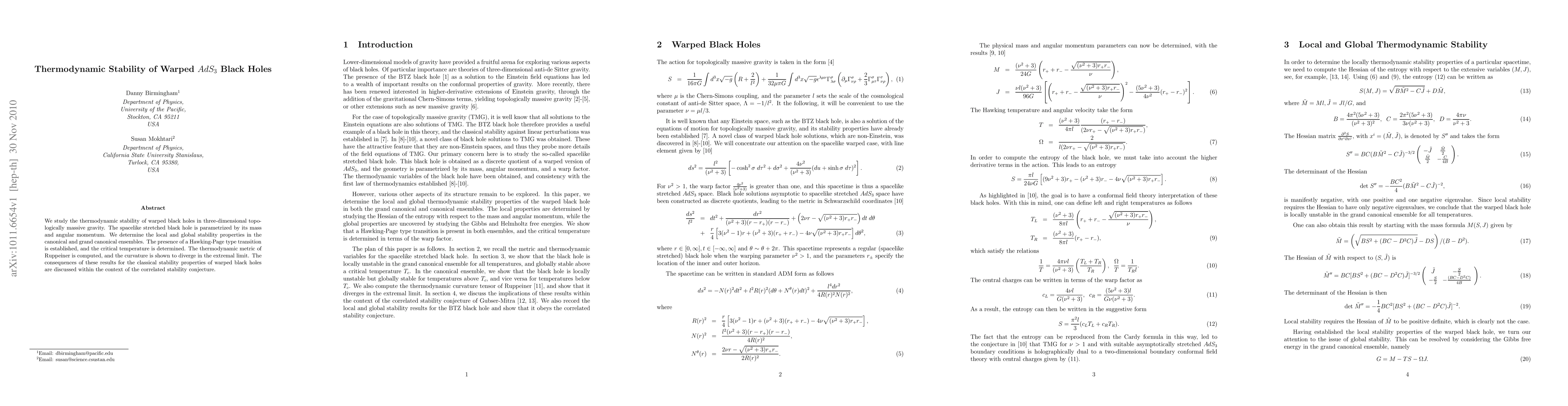 This paper investigates the thermodynamic stability of warped black holes in three-dimensional topologically massive gravity, determining local and global stability in both canonical and grand canonical ensembles. It reveals a Hawking-Page transition and discusses the implications for classical stability, supported by the divergence of the Ruppeiner thermodynamic metric's curvature in the extremal limit.