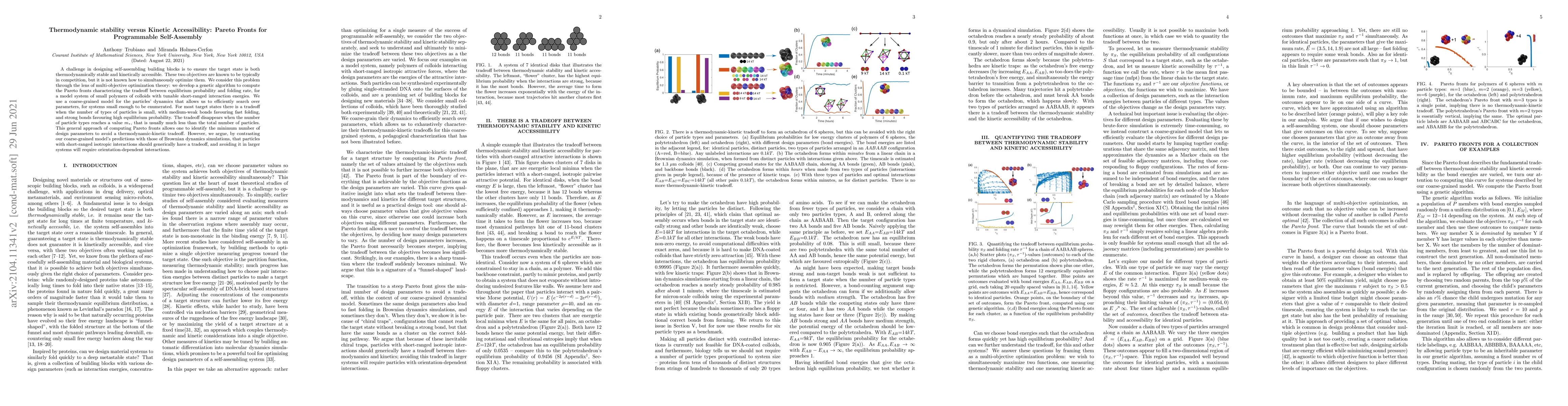 This paper develops a genetic algorithm to optimize the balance between thermodynamic stability and kinetic accessibility in self-assembling systems, identifying a Pareto front that characterizes the tradeoff between equilibrium probability and folding rate. It finds that for small systems, a tradeoff exists, but it vanishes when the number of particle types reaches a critical value $m_*$.