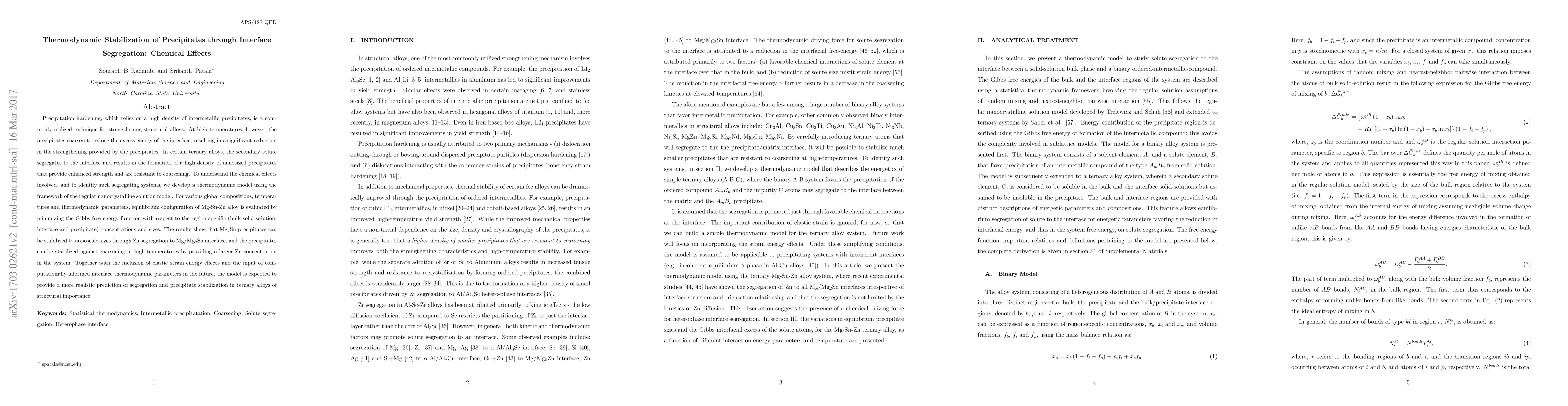 Precipitation hardening, which relies on a high density of intermetallic precipitates, is a commonly utilized technique for strengthening structural alloys. Structural alloys are commonly strengthened through a high density of small size intermetallic precipitates. At high temperatures, however, the precipitates coarsen to reduce the excess energy of the interface, resulting in a significant reduction in the strengthening provided by the precipitates. In certain ternary alloys, the secondary solute segregates to the interface and results in the formation of a high density of nanosize precipitates that provide enhanced strength and are resistant to coarsening. To understand the chemical effects involved, and to identify such systems, we develop a thermodynamic model using the framework of the regular nanocrystalline solution model. For various global compositions, temperatures and thermodynamic parameters, equilibrium configuration of Mg-Sn-Zn alloy is evaluated by minimizing the Gibbs free energy function with respect to the region-specific (bulk solid-solution, interface and precipitate) concentrations and sizes. The results show that Mg$_2$Sn precipitates can be stabilized to nanoscale sizes through Zn segregation to Mg/Mg$_2$Sn interface, and the precipitates can be stabilized against coarsening at high-temperatures by providing a larger Zn concentration in the system. Together with the inclusion of elastic strain energy effects and the input of computationally informed interface thermodynamic parameters in the future, the model is expected to provide a more realistic prediction of segregation and precipitate stabilization in ternary alloys of structural importance.