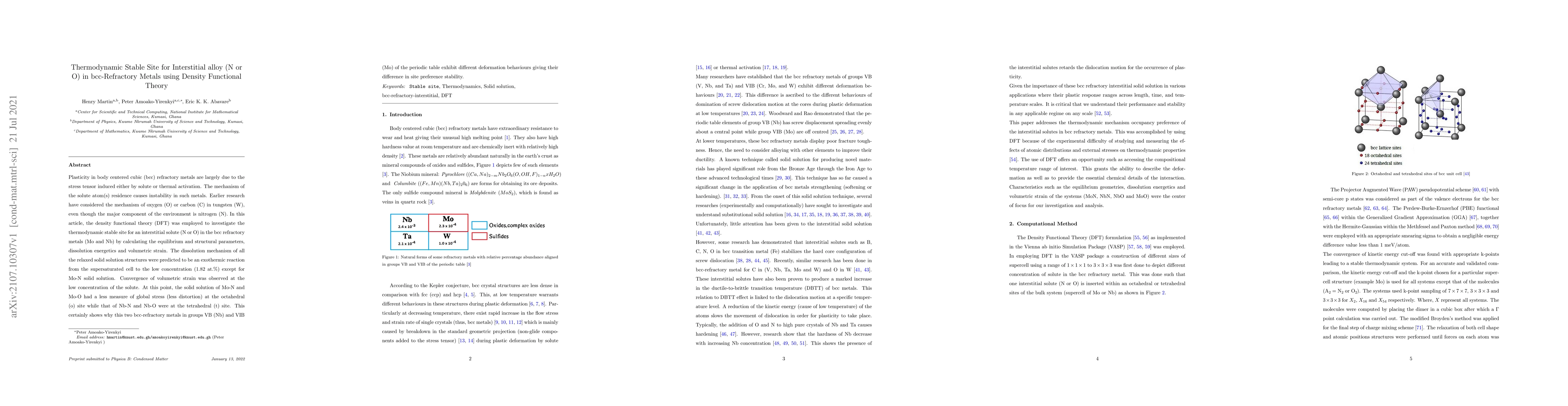 This paper uses density functional theory to determine the thermodynamically stable sites for interstitial nitrogen (N) or oxygen (O) in bcc refractory metals molybdenum (Mo) and niobium (Nb). The study reveals that Mo-N and Mo-O prefer the octahedral site while Nb-N and Nb-O prefer the tetrahedral site, explaining their differing deformation behaviors.