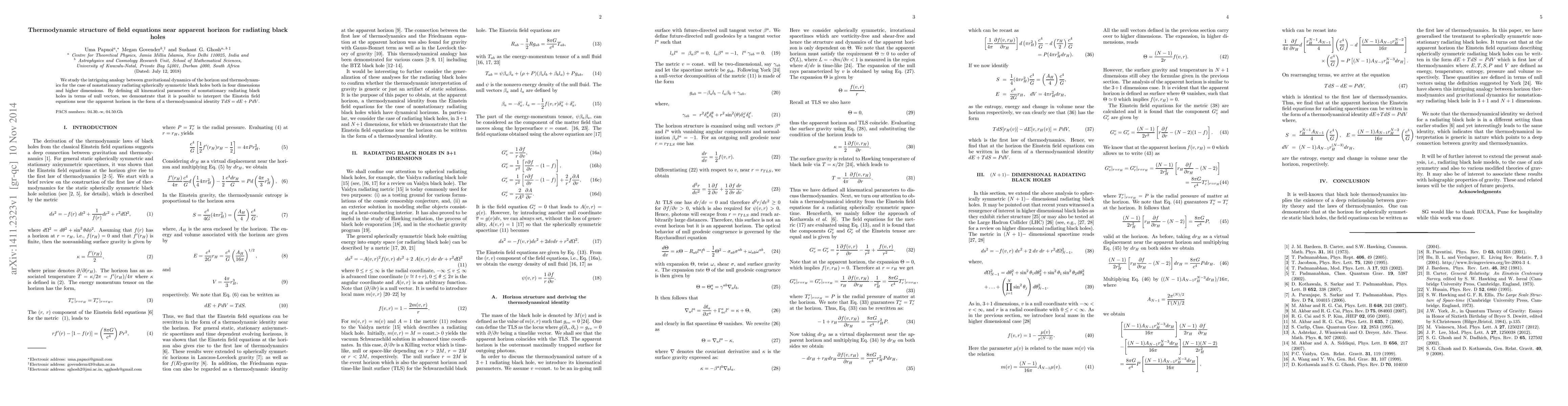This paper explores the thermodynamic analogy in the gravitational dynamics of radiating black holes, showing that the Einstein field equations near the apparent horizon can be expressed as a thermodynamic identity $TdS=dE+PdV$, akin to classical thermodynamics. This study applies to both four-dimensional and higher-dimensional black holes.