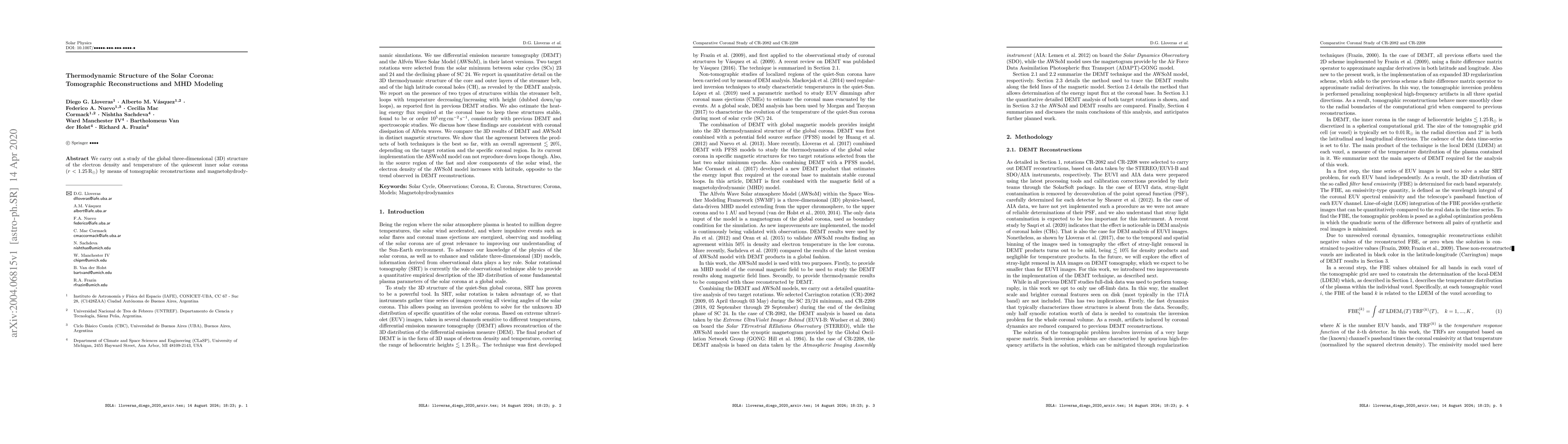 This study uses tomographic reconstructions and magnetohydrodynamic modeling to analyze the 3D thermodynamic structure of the solar corona, revealing distinct structures like down/up loops within the streamer belt and estimating the required heating energy flux. The results show good agreement between the techniques, though some discrepancies remain, particularly in coronal hole regions.