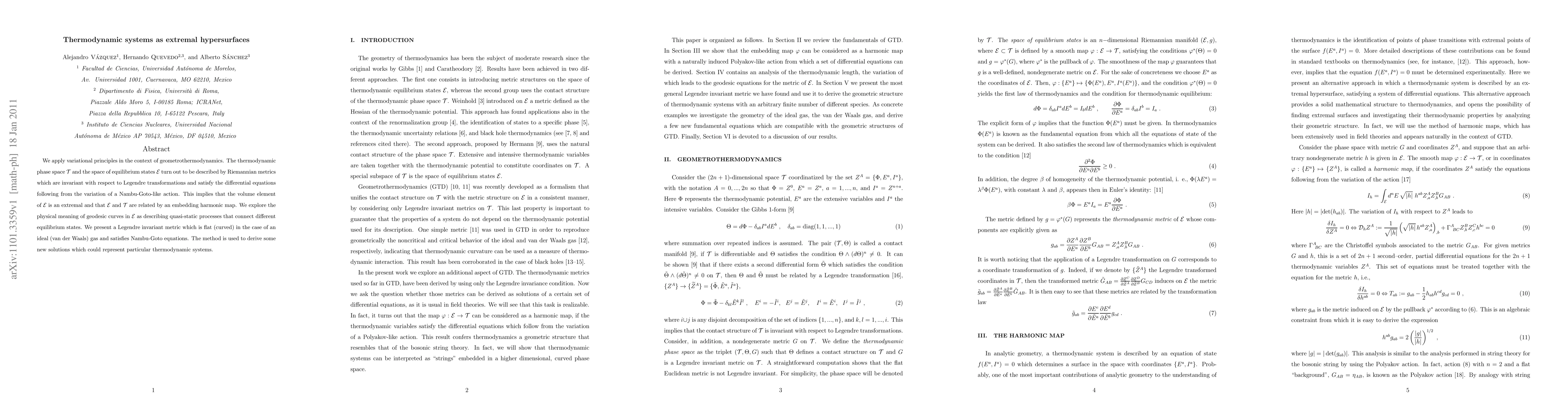 We apply variational principles in the context of geometrothermodynamics. The thermodynamic phase space ${\cal T}$ and the space of equilibrium states ${\cal E}$ turn out to be described by Riemannian metrics which are invariant with respect to Legendre transformations and satisfy the differential equations following from the variation of a Nambu-Goto-like action. This implies that the volume element of ${\cal E}$ is an extremal and that ${\cal E}$ and ${\cal T}$ are related by an embedding harmonic map. We explore the physical meaning of geodesic curves in ${\cal E}$ as describing quasi-static processes that connect different equilibrium states. We present a Legendre invariant metric which is flat (curved) in the case of an ideal (van der Waals) gas and satisfies Nambu-Goto equations. The method is used to derive some new solutions which could represent particular thermodynamic systems.