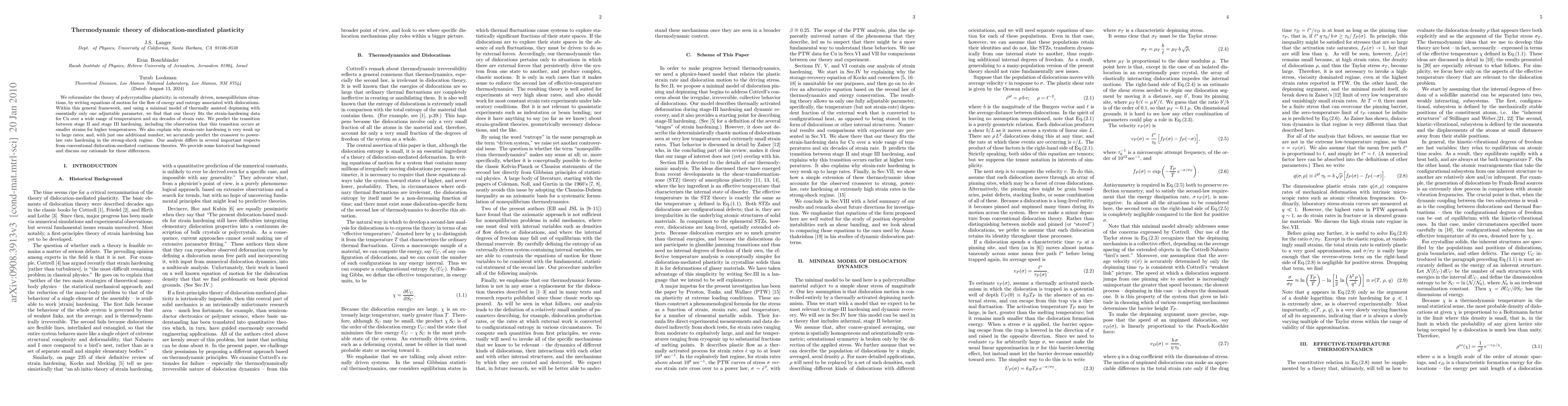 We reformulate the theory of polycrystalline plasticity, in externally driven, nonequilibrium situations, by writing equations of motion for the flow of energy and entropy associated with dislocations. Within this general framework, and using a minimal model of thermally assisted depinning with essentially only one adjustable parameter, we find that our theory fits the strain-hardening data for Cu over a wide range of temperatures and six decades of strain rate. We predict the transition between stage II and stage III hardening, including the observation that this transition occurs at smaller strains for higher temperatures. We also explain why strain-rate hardening is very weak up to large rates; and, with just one additional number, we accurately predict the crossover to power-law rate hardening in the strong-shock regime. Our analysis differs in several important respects from conventional dislocation-mediated continuum theories. We provide some historical background and discuss our rationale for these differences.