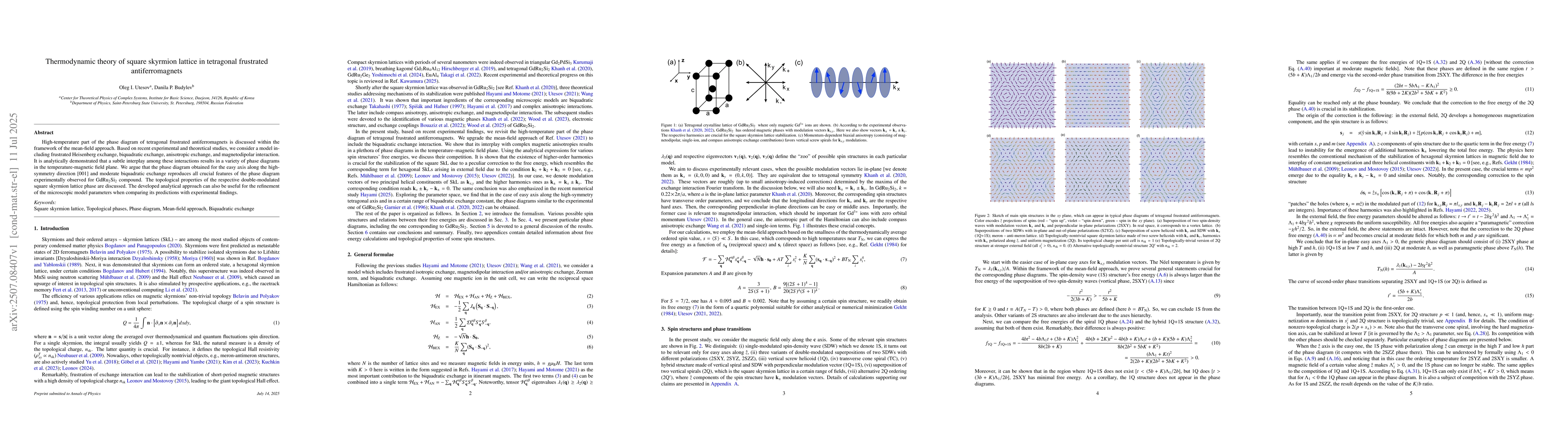 High-temperature part of the phase diagram of tetragonal frustrated antiferromagnets is discussed within the framework of the mean-field approach. Based on recent experimental and theoretical studies, we consider a model including frustrated Heisenberg exchange, biquadratic exchange, anisotropic exchange, and magnetodipolar interaction. It is analytically demonstrated that a subtle interplay among these interactions results in a variety of phase diagrams in the temperature-magnetic field plane. We argue that the phase diagram obtained for the easy axis along the high-symmetry direction $[001]$ and moderate biquadratic exchange reproduces all crucial features of the phase diagram experimentally observed for~\gdru~compound. The topological properties of the respective double-modulated square skyrmion lattice phase are discussed. The developed analytical approach can also be useful for the refinement of the microscopic model parameters when comparing its predictions with experimental findings.