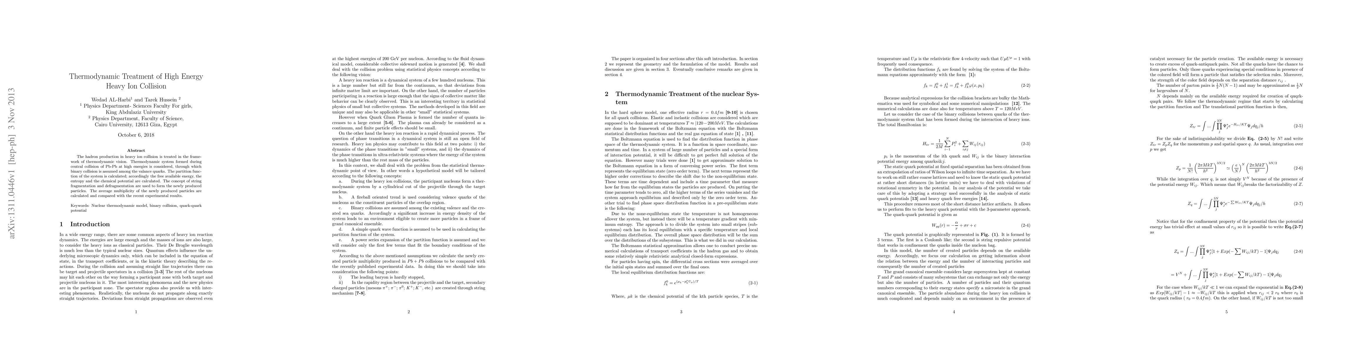 This paper employs thermodynamic principles to analyze hadron production in high-energy heavy ion collisions, specifically Pb-Pb central collisions, calculating the partition function, free energy, entropy, and chemical potential. It also uses string fragmentation concepts to model particle formation and compares the resulting particle multiplicity with experimental data.