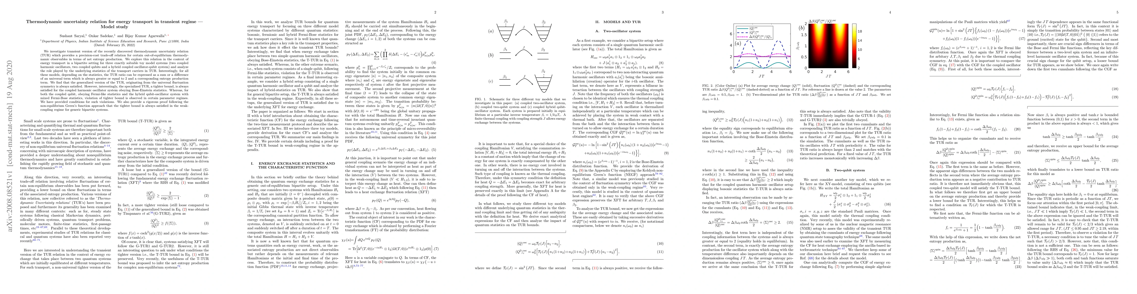 This paper explores the transient thermodynamic uncertainty relation (TUR) in energy transport, analyzing three toy model systems. It finds that the generalized TUR holds universally, but the tighter specialized TUR is only satisfied for systems obeying Bose-Einstein statistics, while systems with Fermi-like or mixed Fermi-Bose statistics show violations under certain conditions.