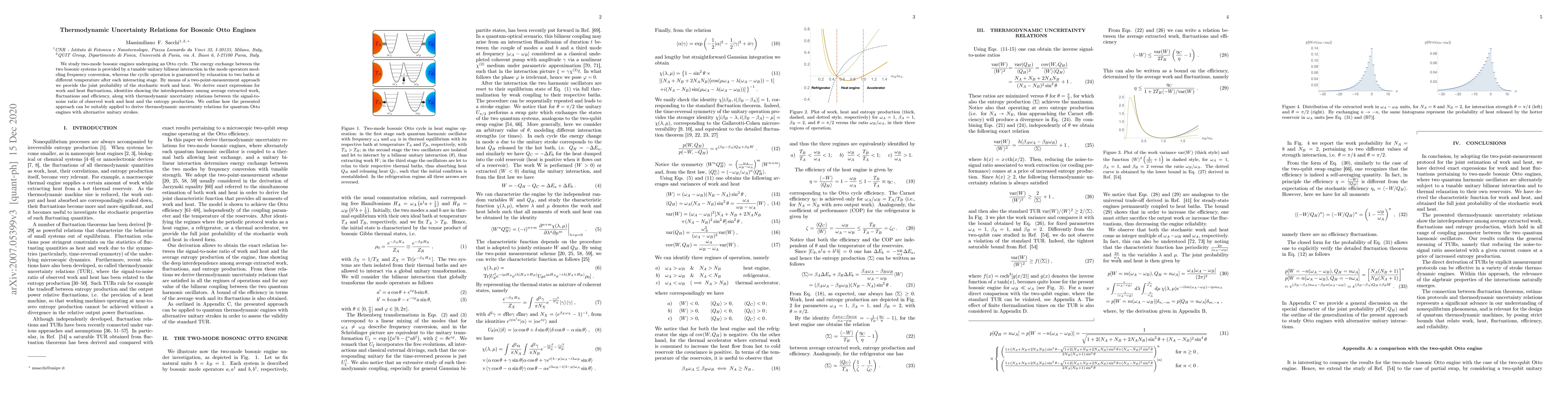 This paper explores thermodynamic uncertainty relations in two-mode bosonic Otto engines, deriving exact expressions for work and heat fluctuations and establishing connections between average extracted work, fluctuations, and efficiency. The study introduces a two-point-measurement approach to analyze entropy production and provides a framework applicable to quantum Otto engines with various unitary operations.