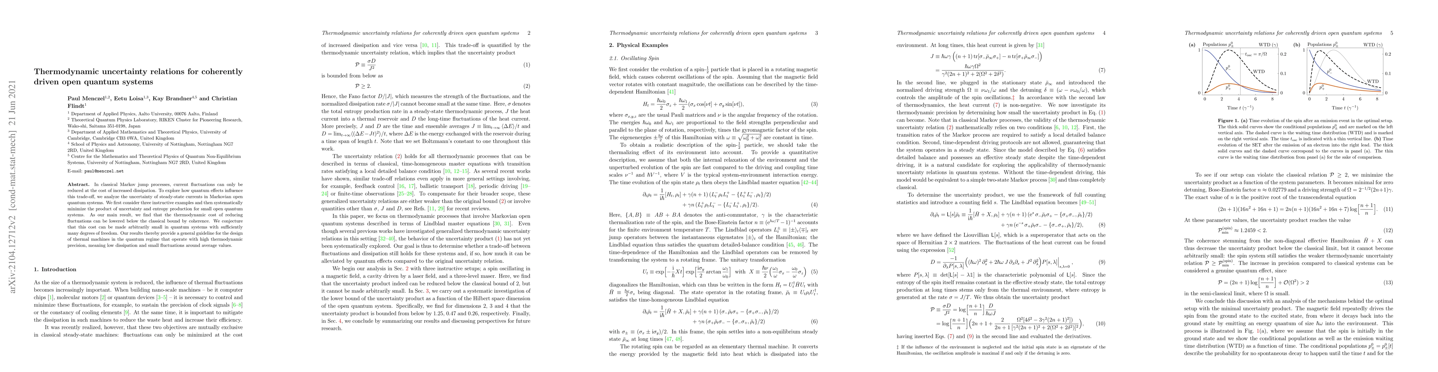 In classical Markov jump processes, current fluctuations can only be reduced at the cost of increased dissipation. To explore how quantum effects influence this trade-off, we analyze the uncertainty of steady-state currents in Markovian open quantum systems. We first consider three instructive examples and then systematically minimize the product of uncertainty and entropy production for small open quantum systems. As our main result, we find that the thermodynamic cost of reducing fluctuations can be lowered below the classical bound by coherence. We conjecture that this cost can be made arbitrarily small in quantum systems with sufficiently many degrees of freedom. Our results thereby provide a general guideline for the design of thermal machines in the quantum regime that operate with high thermodynamic precision, meaning low dissipation and small fluctuations around average values.