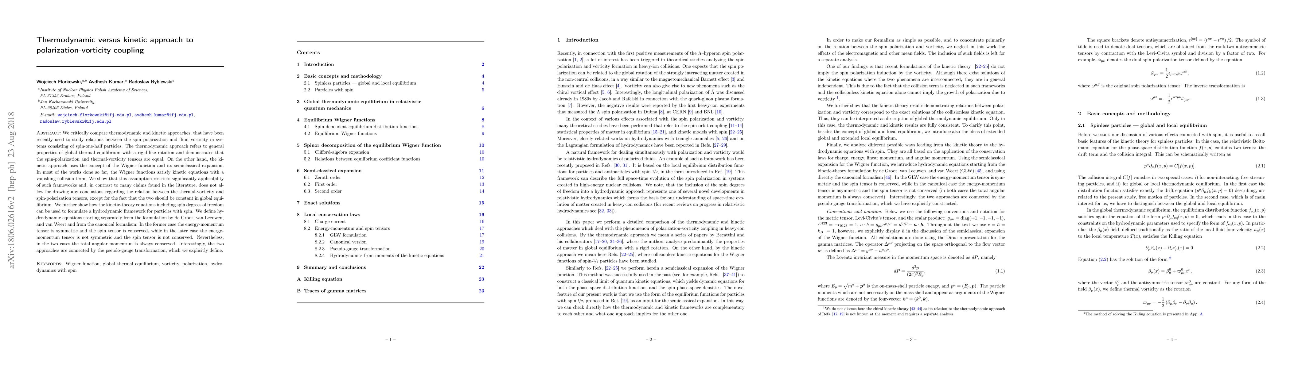 We critically compare thermodynamic and kinetic approaches, that have been recently used to study relations between the spin polarization and fluid vorticity in systems consisting of spin-one-half particles. The thermodynamic approach refers to general properties of global thermal equilibrium with a rigid-like rotation and demonstrates that the spin-polarization and thermal-vorticity tensors are equal. On the other hand, the kinetic approach uses the concept of the Wigner function and its semi-classical expansion. In most of the works done so far, the Wigner functions satisfy kinetic equations with a vanishing collision term. We show that this assumption restricts significantly applicability of such frameworks and, in contrast to many claims found in the literature, does not allow for drawing any conclusions regarding the relation between the thermal-vorticity and spin-polarization tensors, except for the fact that the two should be constant in global equilibrium. We further show how the kinetic-theory equations including spin degrees of freedom can be used to formulate a hydrodynamic framework for particles with spin. We define hydrodynamic equations starting separately from the formulation by de~Groot, van~Leeuwen, and van~Weert and from the canonical formalism. In the former case the energy-momentum tensor is symmetric and the spin tensor is conserved, while in the later case the energy-momentum tensor is not symmetric and the spin tensor is not conserved. Nevertheless, in the two cases the total angular momentum is always conserved. Interestingly, the two approaches are connected by the pseudo-gauge transformation, which we explicitly define.