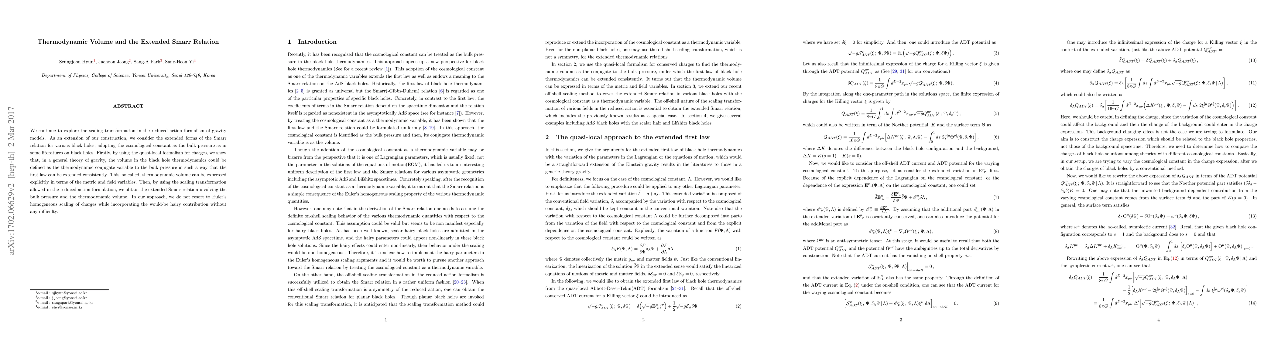 This paper extends the Smarr relation for various black holes by defining a thermodynamic volume as the conjugate variable to the bulk pressure, allowing for a consistent thermodynamic first law. The extended Smarr relation is derived using scaling transformations in the reduced action formalism, incorporating bulk pressure and volume without relying on Euler's homogeneous scaling.