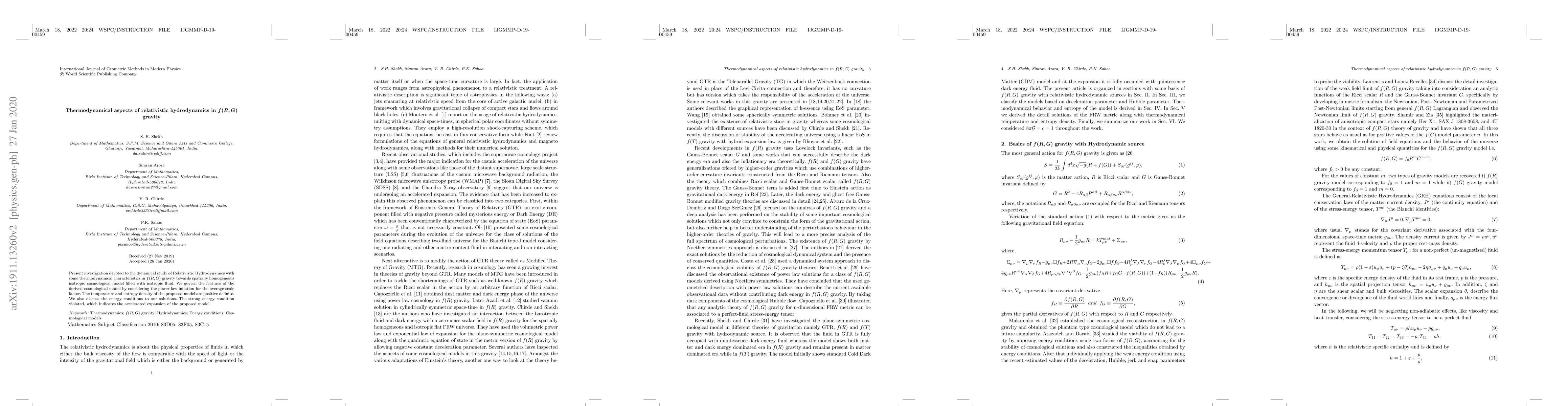 Present investigation devoted to the dynamical study of Relativistic Hydrodynamics with some thermodynamical characteristics in $f(R,G)$ gravity towards spatially homogeneous isotropic cosmological model filled with isotropic fluid. We govern the features of the derived cosmological model by considering the power-law inflation for the average scale factor. The temperature and entropy density of the proposed model are positive definite. We also discuss the energy conditions to our solutions. The strong energy condition violated, which indicates the accelerated expansion of the proposed model.
