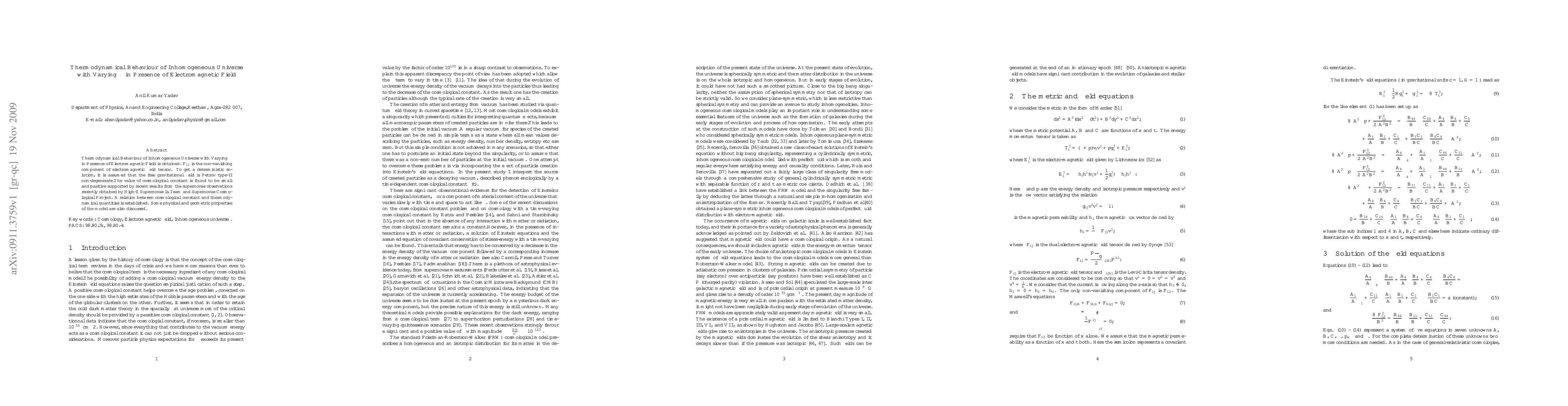 Thermodynamical Behaviour of Inhomogeneous Universe with Varying $ \Lambda $ in Presence of Electromagnetic Field is obtained. $ F_{12} $ is the non-vanishing component of electromagnetic field tensor. To get a deterministic solution, it is assumed that the free gravitational field is Petrov type-II non-degenerate.The value of cosmological constant is found to be small and pasitive supported by recent results from the supernovae observations recently obtained by High-Z Supernovae Ia Team and Supernovae Cosmological Project. A relation between cosmological constant and thermodynamical quantities is established. Some physical and geometric properties of the model are also discussed.