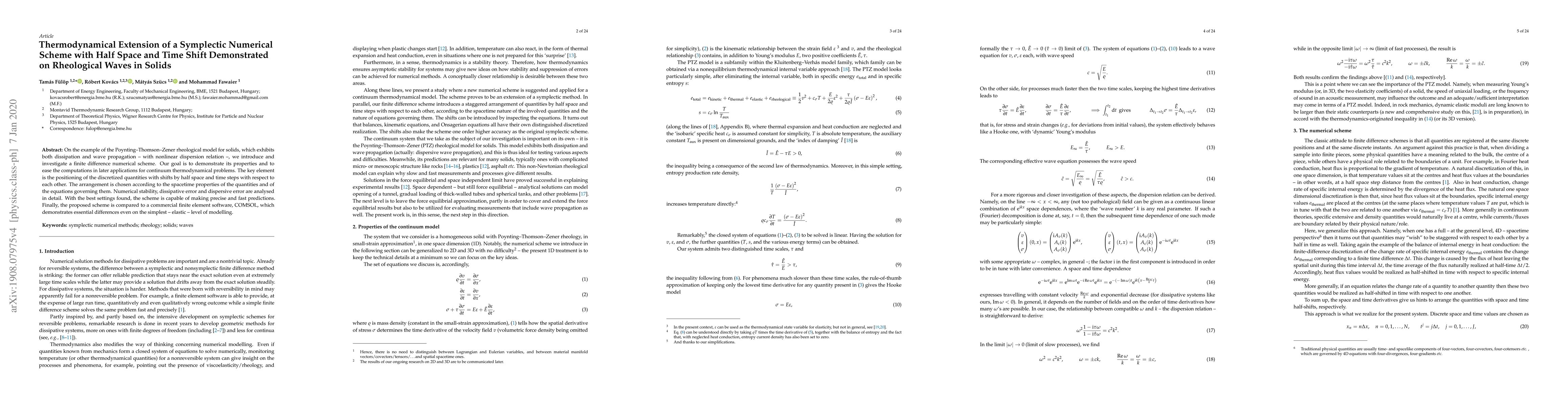 On the example of the Poynting-Thomson-Zener rheological model for solids, which exhibits both dissipation and wave propagation - with nonlinear dispersion relation -, we introduce and investigate a finite difference numerical scheme. Our goal is to demonstrate its properties and to ease the computations in later applications for continuum thermodynamical problems. The key element is the positioning of the discretized quantities with shifts by half space and time steps with respect to each other. The arrangement is chosen according to the spacetime properties of the quantities and of the equations governing them. Numerical stability, dissipative error and dispersive error are analysed in detail. With the best settings found, the scheme is capable of making precise and fast predictions. Finally, the proposed scheme is compared to a commercial finite element software, COMSOL, which demonstrates essential differences even on the simplest - elastic - level of modelling.