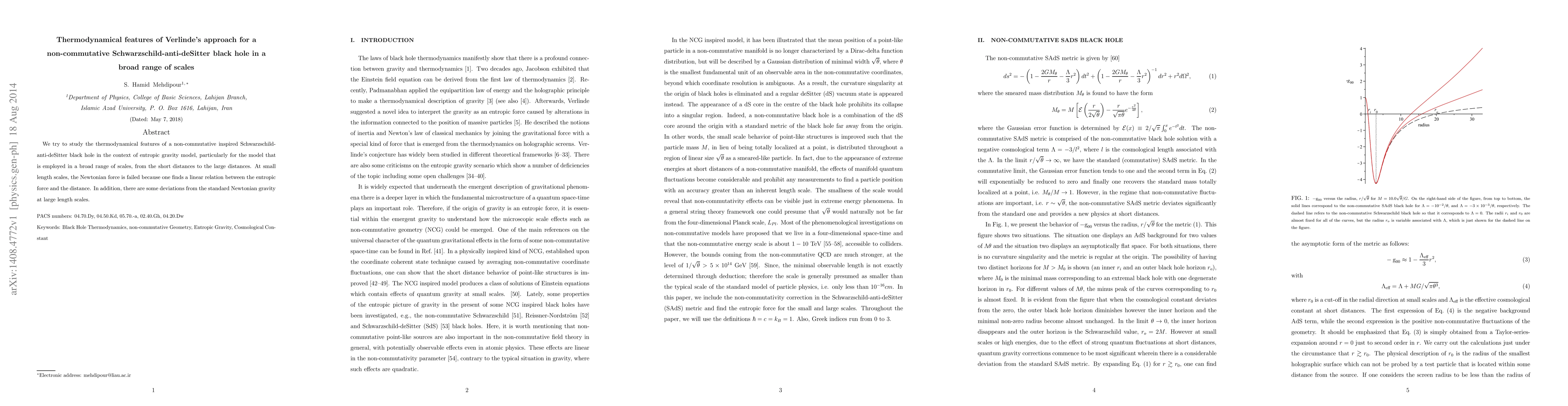 We try to study the thermodynamical features of a non-commutative inspired Schwarzschild-anti-deSitter black hole in the context of entropic gravity model, particularly for the model that is employed in a broad range of scales, from the short distances to the large distances. At small length scales, the Newtonian force is failed because one finds a linear relation between the entropic force and the distance. In addition, there are some deviations from the standard Newtonian gravity at large length scales.