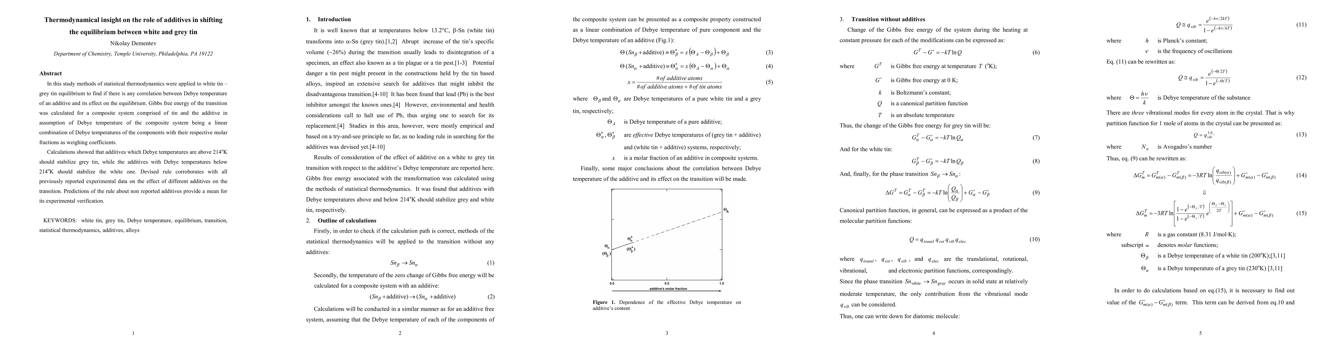 In this study methods of statistical thermodynamics were applied to white tin - grey tin equilibrium to find if there is any correlation between Debye temperature of an additive and its effect on the equilibrium. Gibbs free energy of the transition was calculated for a composite system comprised of tin and the additive in assumption of Debye temperature of the composite system being a linear combination of Debye temperatures of the components with their respective molar fractions as weighing coefficients. Calculations showed that additives which Debye temperatures are above 214oK should stabilize grey tin, while the additives with Debye temperatures below 214oK should stabilize the white one. Devised rule corroborates with all previously reported experimental data on the effect of different additives on the transition. Predictions of the rule about non reported additives provide a mean for its experimental verification.