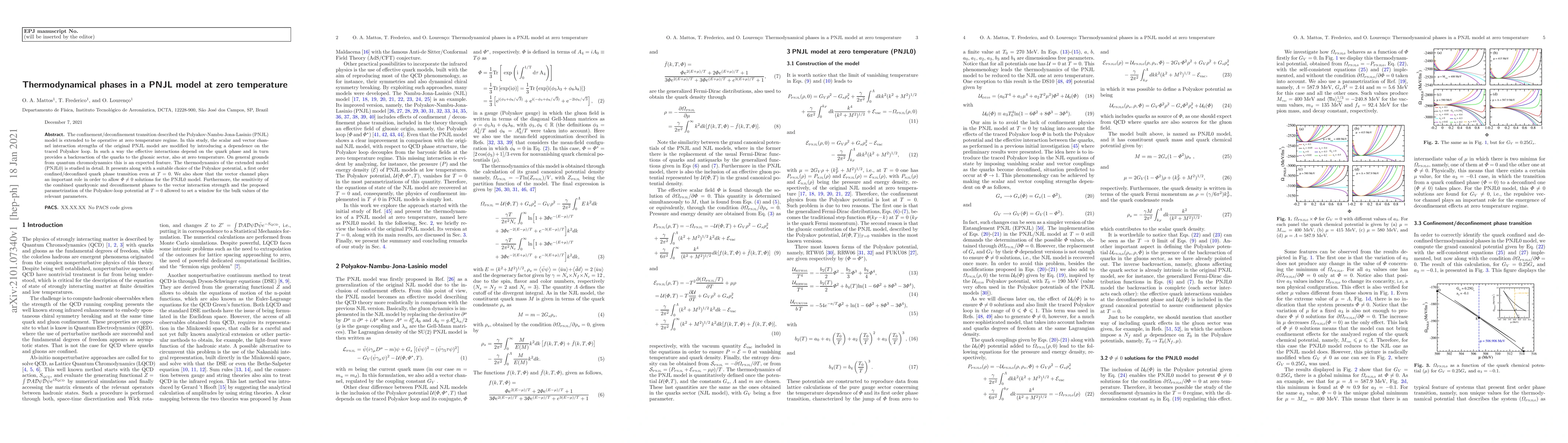 This paper explores the thermodynamical phases in a zero-temperature PNJL model, modifying the interaction strengths to depend on the traced Polyakov loop, which allows for a backreaction of quarks on the gluonic sector. The study reveals a first-order confined/deconfined phase transition at $T=0$ and highlights the importance of the vector channel in enabling $\Phi\ne0$ solutions.