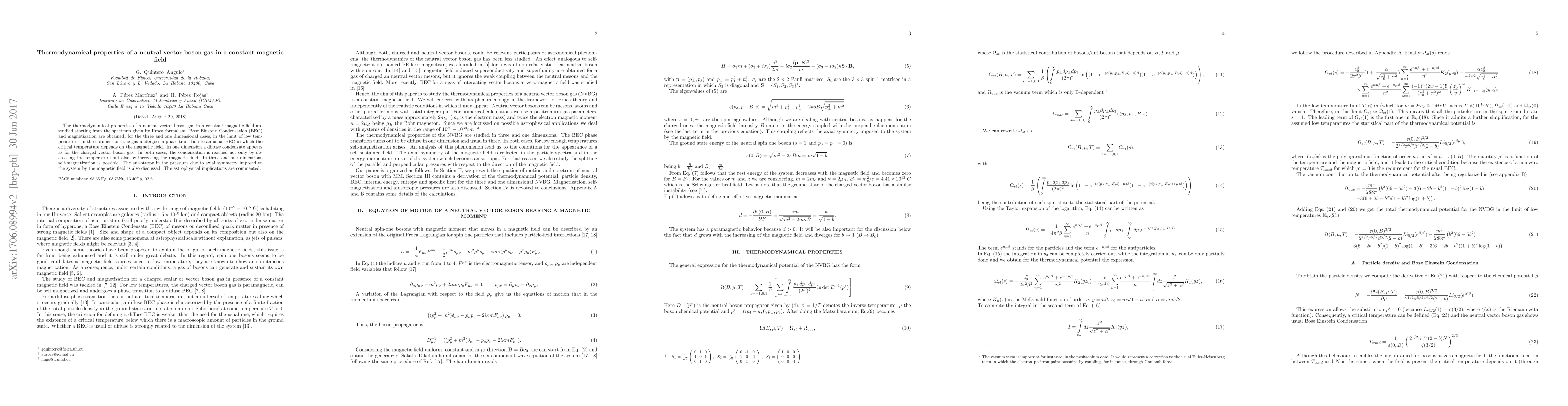 The thermodynamical properties of a neutral vector boson gas in a constant magnetic field are studied starting from the spectrum given by Proca formalism. Bose Einstein Condensation (BEC) and magnetization are obtained, for the three and one dimensional cases, in the limit of low temperatures. In three dimensions the gas undergoes a phase transition to an usual BEC in which the critical temperature depends on the magnetic field. In one dimension a diffuse condensate appears as for the charged vector boson gas. In both cases, the condensation is reached not only by decreasing the temperature but also by increasing the magnetic field. In three and one dimensions self-magnetization is possible. The anisotropy in the pressures due to axial symmetry imposed to the system by the magnetic field is also discussed. The astrophysical implications are commented.