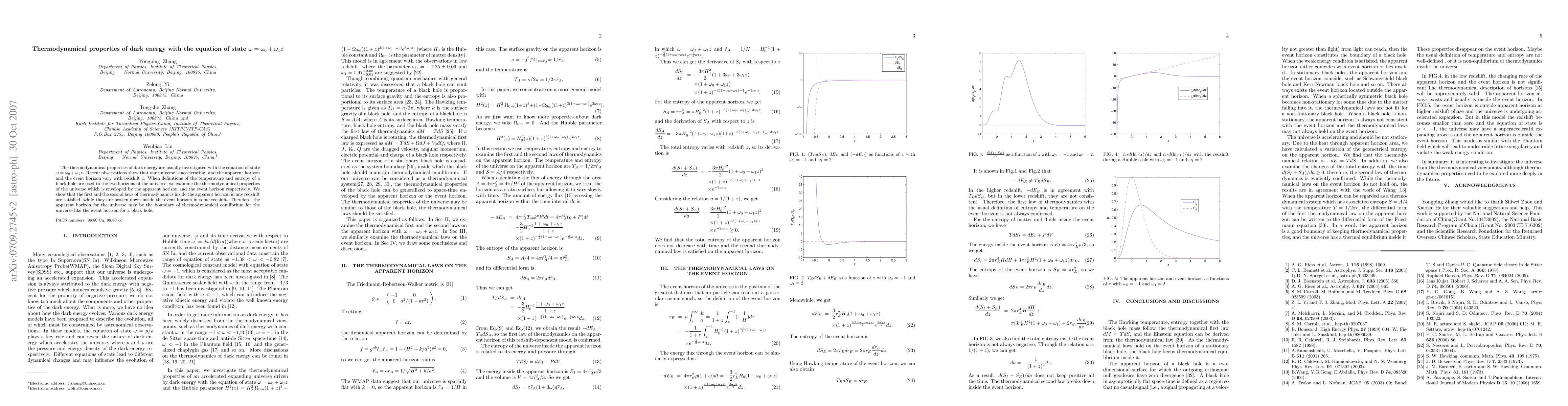 The thermodynamical properties of dark energy are usually investigated with the equation of state $\omega =\omega_{0}+\omega_{1}z$. Recent observations show that our universe is accelerating, and the apparent horizon and the event horizon vary with redshift $z$. When definitions of the temperature and entropy of a black hole are used to the two horizons of the universe, we examine the thermodynamical properties of the universe which is enveloped by the apparent horizon and the event horizon respectively. We show that the first and the second laws of thermodynamics inside the apparent horizon in any redshift are satisfied, while they are broken down inside the event horizon in some redshift. Therefore, the apparent horizon for the universe may be the boundary of thermodynamical equilibrium for the universe like the event horizon for a black hole.