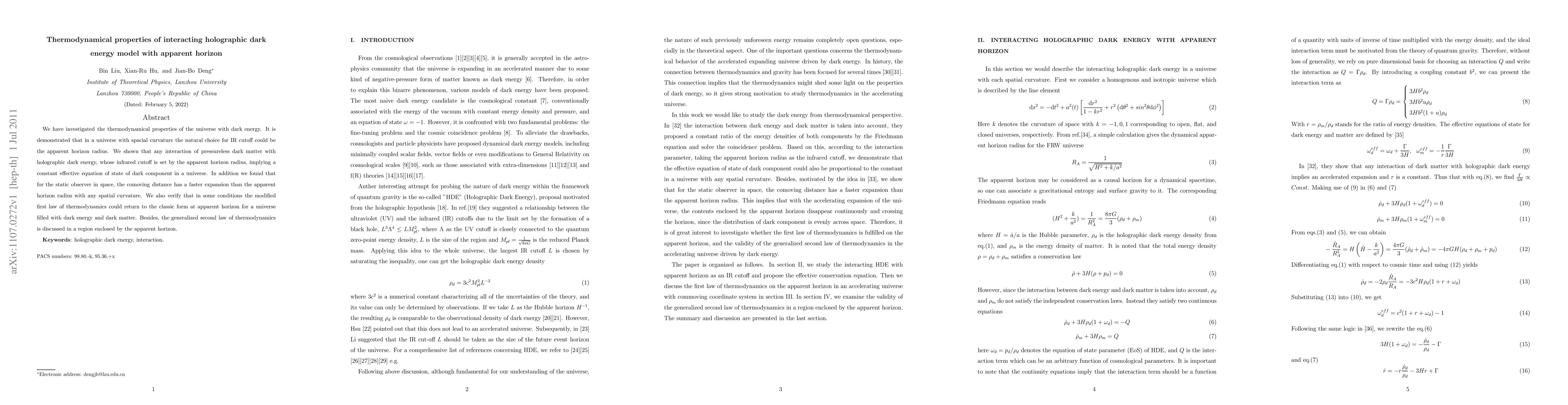 We have investigated the thermodynamical properties of the universe with dark energy. It is demonstrated that in a universe with spacial curvature the natural choice for IR cutoff could be the apparent horizon radius. We shown that any interaction of pressureless dark matter with holographic dark energy, whose infrared cutoff is set by the apparent horizon radius, implying a constant effective equation of state of dark component in a universe. In addition we found that for the static observer in space, the comoving distance has a faster expansion than the apparent horizon radius with any spatial curvature. We also verify that in some conditions the modified first law of thermodynamics could return to the classic form at apparent horizon for a universe filled with dark energy and dark matter. Besides, the generalized second law of thermodynamics is discussed in a region enclosed by the apparent horizon.