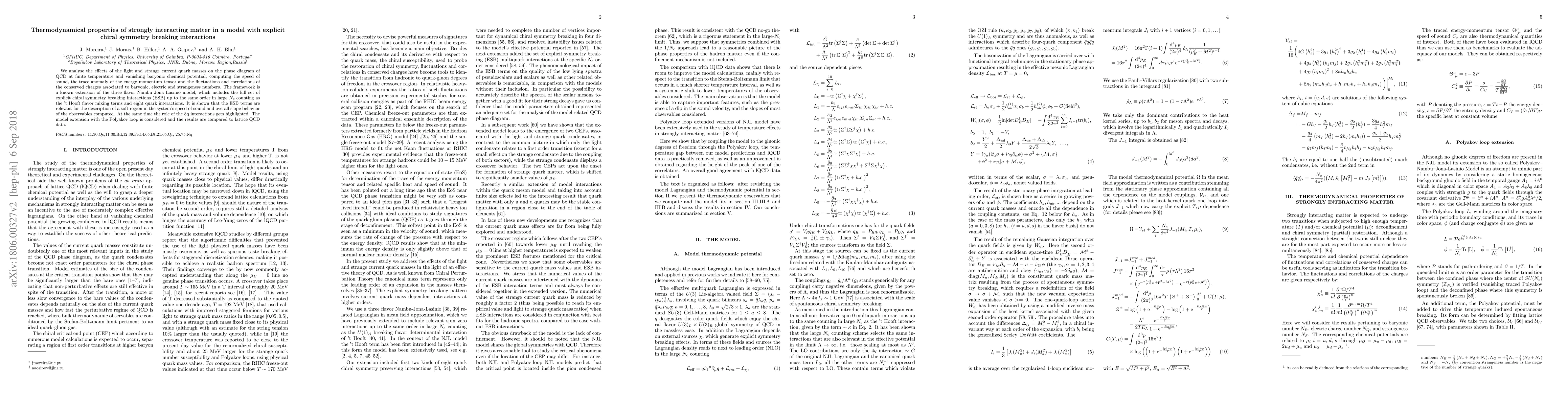 We analyse the effects of the light and strange current quark masses on the phase diagram of QCD at finite temperature and vanishing baryonic chemical potential, computing the speed of sound, the trace anomaly of the energy momentum tensor and the fluctuations and correlations of the conserved charges associated to baryonic, electric and strangeness numbers. The framework is a known extension of the three flavor Nambu Jona Lasinio model, which includes the full set of explicit chiral symmetry breaking interactions (ESB) up to the same order in large $N_c$ counting as the 't Hooft flavor mixing terms and eight quark interactions. It is shown that the ESB terms are relevant for the description of a soft region in the system's speed of sound and overall slope behavior of the observables computed. At the same time the role of the 8q interactions gets highlighted. The model extension with the Polyakov loop is considered and the results are compared to lattice QCD data.