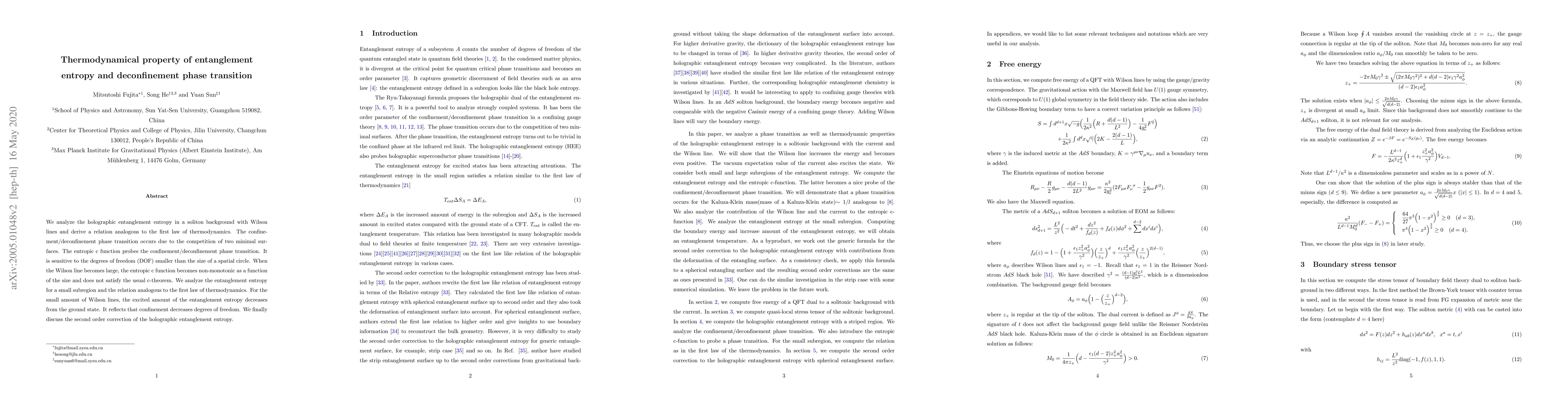 This paper explores the holographic entanglement entropy in a soliton background with Wilson lines, establishing a thermodynamical relation analogous to the first law of thermodynamics. It reveals that the confinement/deconfinement phase transition is driven by the interplay of minimal surfaces and is probed by the entropic c function, which is sensitive to small degrees of freedom.