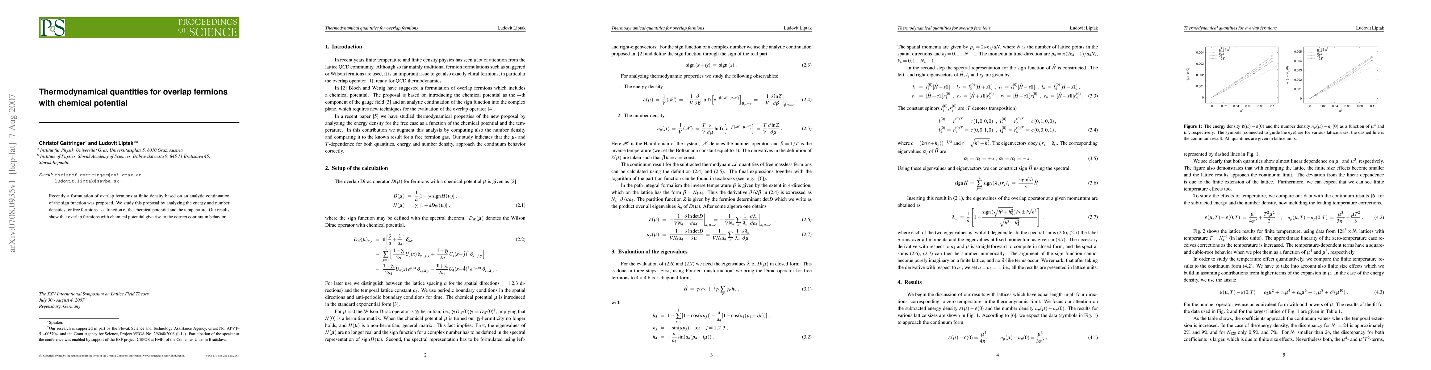 Recently a formulation of overlap fermions at finite density based on an analytic continuation of the sign function was proposed. We study this proposal by analyzing the energy and number densities for free fermions as a function of the chemical potential and the temperature. Our results show that overlap fermions with chemical potential give rise to the correct continuum behavior.