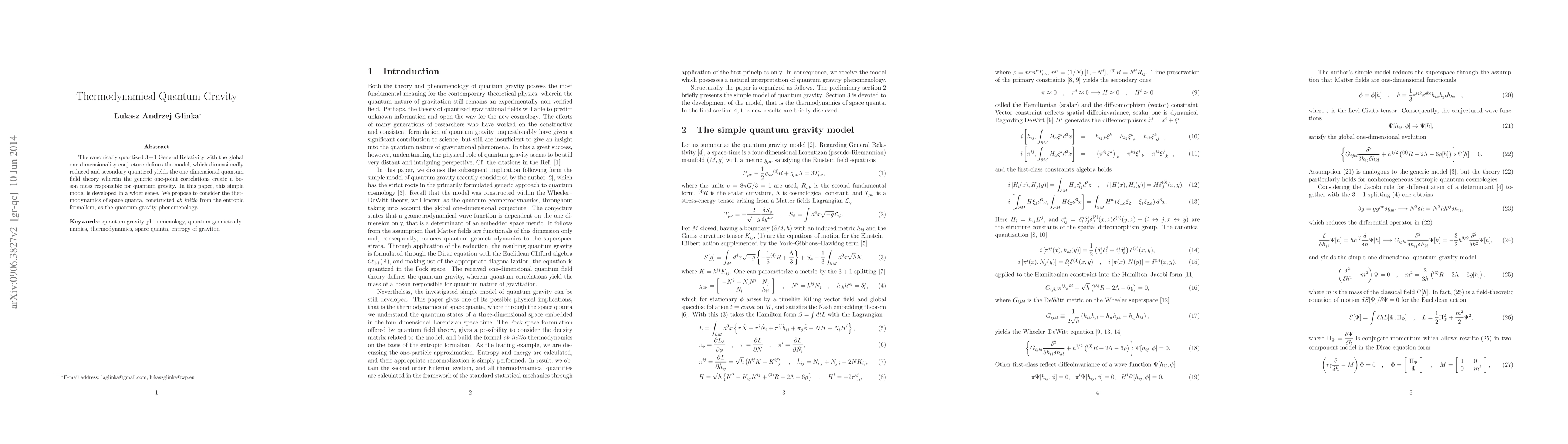 The canonically quantized 3+1 General Relativity with the global one dimensionality conjecture defines the model, which dimensionally reduced and secondary quantized yields the one-dimensional quantum field theory wherein the generic one-point correlations create a boson mass responsible for quantum gravity. In this paper, this simple model is developed in a wider sense. We propose to consider the thermodynamics of space quanta, constructed ab initio from the entropic formalism, as the quantum gravity phenomenology.